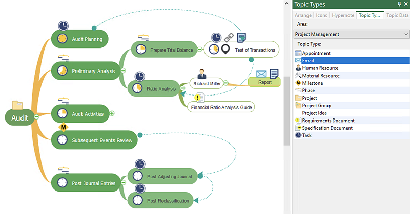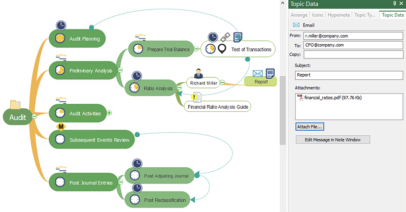 Essential to project management activities is the ability to manage your email messages using a mind map that is integrated with MS Outlook. A mind map topic, assigned as an “Email” topic type can be transformed into an MS Outlook message with one click.