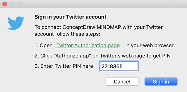- When posting your first Tweet from ConceptDraw MINDMAP you need to Sign In to your Twitter account. Do this using the Twitter options located in the Share tab on Windows, and in the Topic menu on macOS.