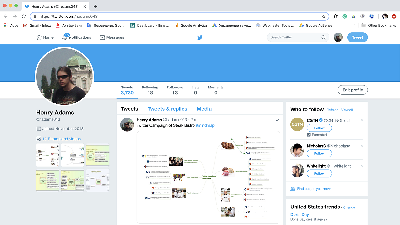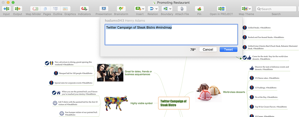 ConceptDraw MINDMAP allows you to post content to your account on Twitter from the mind map directly. The MindTweet solution delivers the ability to manage the sending of Tweets. Users can brainstorm, organize, and plan their Tweets using the creative approach of mind mapping, and then publish directly from their mind map with a single click. MindTweet helps visually organize social media activities for Twitter, LinkedIn, Facebook and YouTube.