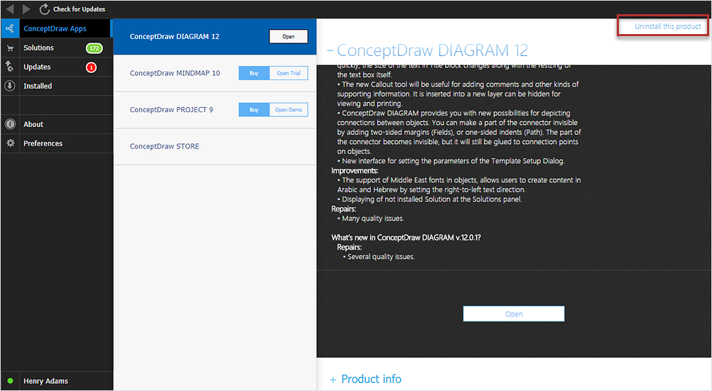 How to Uninstall ConceptDraw Products on WindowsCS Odessa provides registered users a 21 day trial period at no charge. A Trial License can be used to run a fully functional version of ConceptDraw products for 21 days. Trial mode functions exactly as a fully licensed copy of the product does. There are no limitations to functionality, like file size, printing, or exporting. After your trial has expired and you have not yet purchased a license, the product reverts to Demo mode. In Demo mode, you will be able to create and edit documents, but all save, print, copy, and output options will be disabled. Some users might want to remove ConceptDraw products once their trial period is over. Using the standard Windows system tools is a good idea if you need to uninstall complete ConceptDraw OFFICE application package. However, this does not work if you want to uninstall ConceptDraw solutions or single ConceptDraw product. To remove individual products or solutions, use ConceptDraw STORE. It is the application designed to help manage ConceptDraw products and solutions. It notifies the user of new solutions and updates that are available for download. ConceptDraw STORE delivers access to content related to all ConceptDraw products. An ever-growing array of structured business graphics solutions is accessible via the STORE. It sometimes happens that the user needs to remove a previously installed application or solution. This also can be done using ConceptDraw STORE.