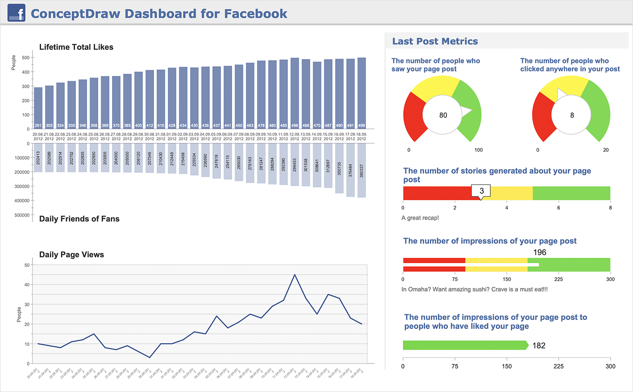 The ConceptDraw Dashboard for Facebook Solution is a visual dashboard that visualizes lifetime total Likes, daily Friends of Fans, and daily Page views based on the information exported from your Facebook Page. To use this Solution, you will need ConceptDraw PRO v9.3.1 (or later) and the ConceptDraw Dashboard for Facebook solution installed. The ConceptDraw Dashboard for Facebook supports data from text files (*.txt), and MS Excel spreadsheet files (*.xls, *.xlsx).