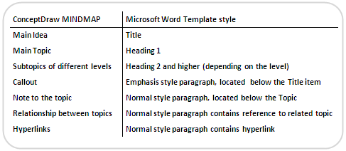 - Mind Map structure is transformed into the structure of the MS Word document in accordance with the custom Template styles:
