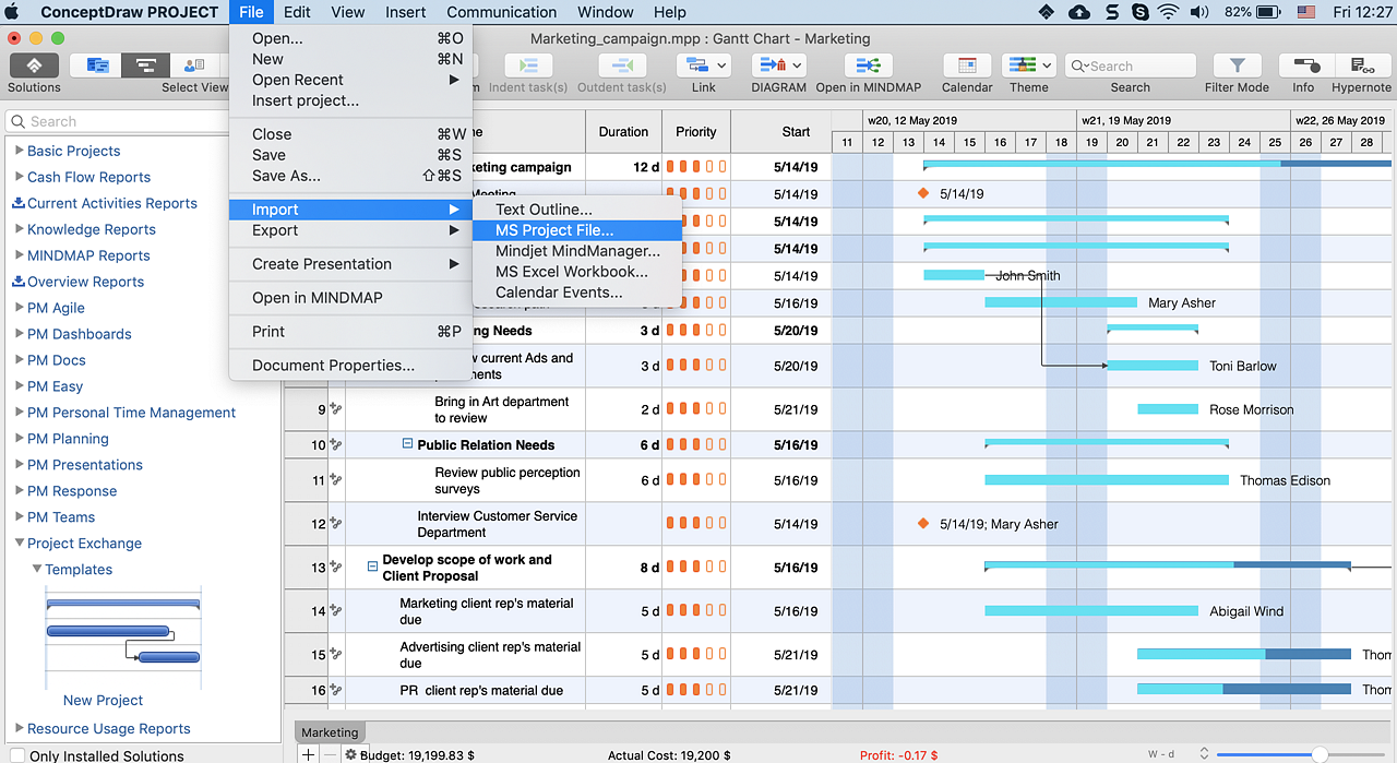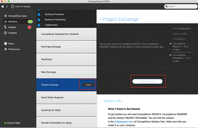 How to Use Project Exchange SolutionConceptDraw Project Exchange solution delivers the ability to exchange project data across different project applications. It provides ConceptDraw PROJECT and MINDMAP with the ability to import MS Project MPP file, and export to MS Project XML files. To access this functionality, you need to install the Project Exchange Solution via ConceptDraw STORE. Find it in the Collaboration category on the Solutions tab.