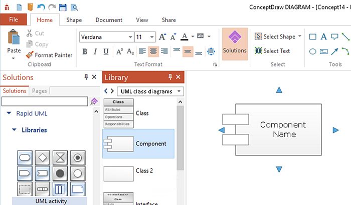 How to Create a UML Diagram Using Rapid UML SolutionUML (Unified Modeling Language™) is used to be a standard for visual documentation of software development and other business processes. to document business processes and software architecture. UML uses several types of diagrams including Use Case Diagrams, Class, Package, Component, Composite Structure Diagrams, Deployments, Activities, and Interactions. The Unified Modeling Language (UML) uses a general set of standard notations for UML diagrams. These notations can visually represent requirements, subsystems, logical and physical elements used in object-oriented programming style. The ability to create UML diagrams in ConceptDraw DIAGRAM is contained in the Rapid UML Solution. This solution provides a set of special tools for creating UML diagrams.