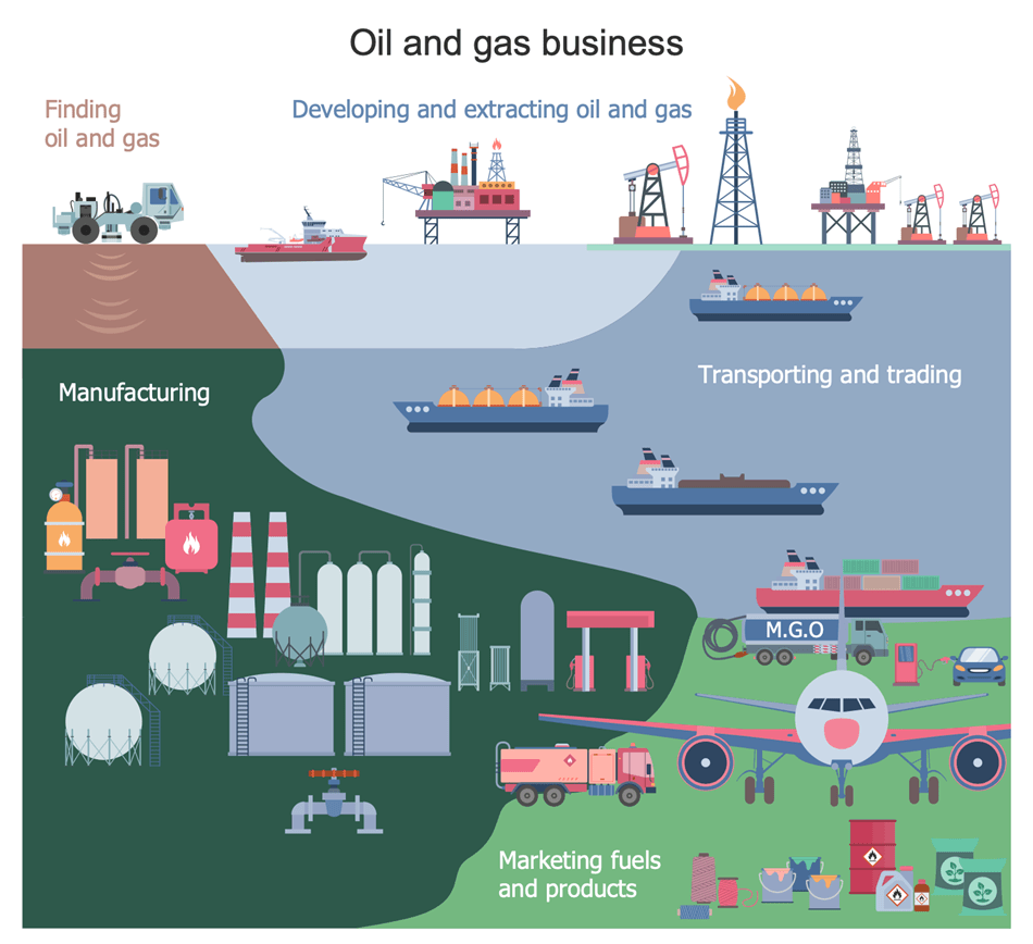ConceptDraw Oil and Gas solution includes 8 libraries containing 234 vector images and 15 samples that can help you to make presentations, messages, and diagrams to illustrate work processes and highlight the factors that have the greatest impact in the oil and gas sector.