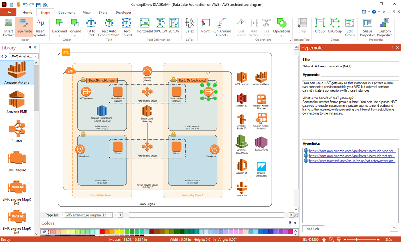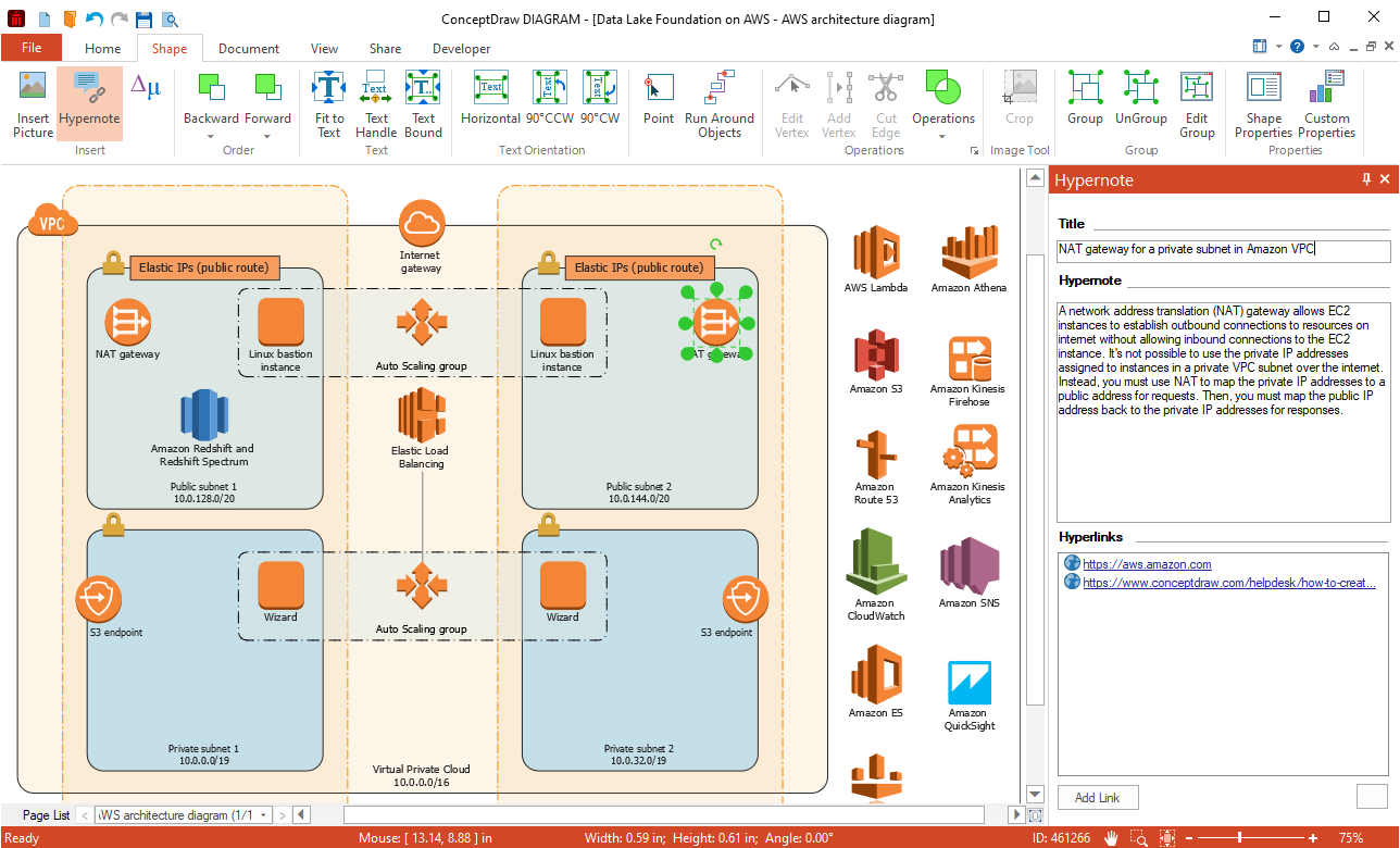 Make the diagram more informative by adding Hyperlinks and Text Notes. The Hypernote panel is the blend of a Text Note with multiple hyperlinks. You can link objects on your diagram to files, folders, web pages and even to other objects.