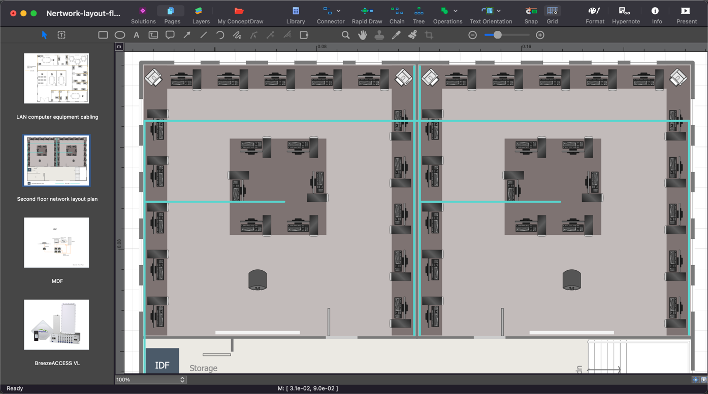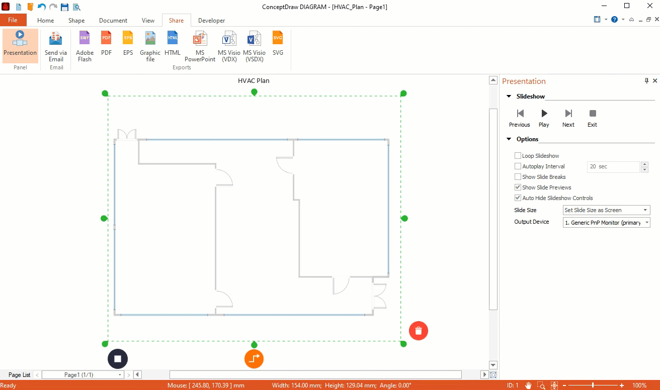 ConceptDraw DIAGRAM offers a wide variety of printing capabilities and customized printing settings. You can even protect objects and entire layers from printing. DIAGRAM supports import and export of the most popular formats: graphics formats (PNG, JPG, BMP, GIF, TIFF); EPS (export Windows version only); Adobe PDF; HTML (export); SVG, and PowerPoint. With Presentation Mode you can perform a full-screen slide show without a need to use any special application. You can embed the animation into your document to make the animated slide show from your drawing using the animated GIF import/export.
