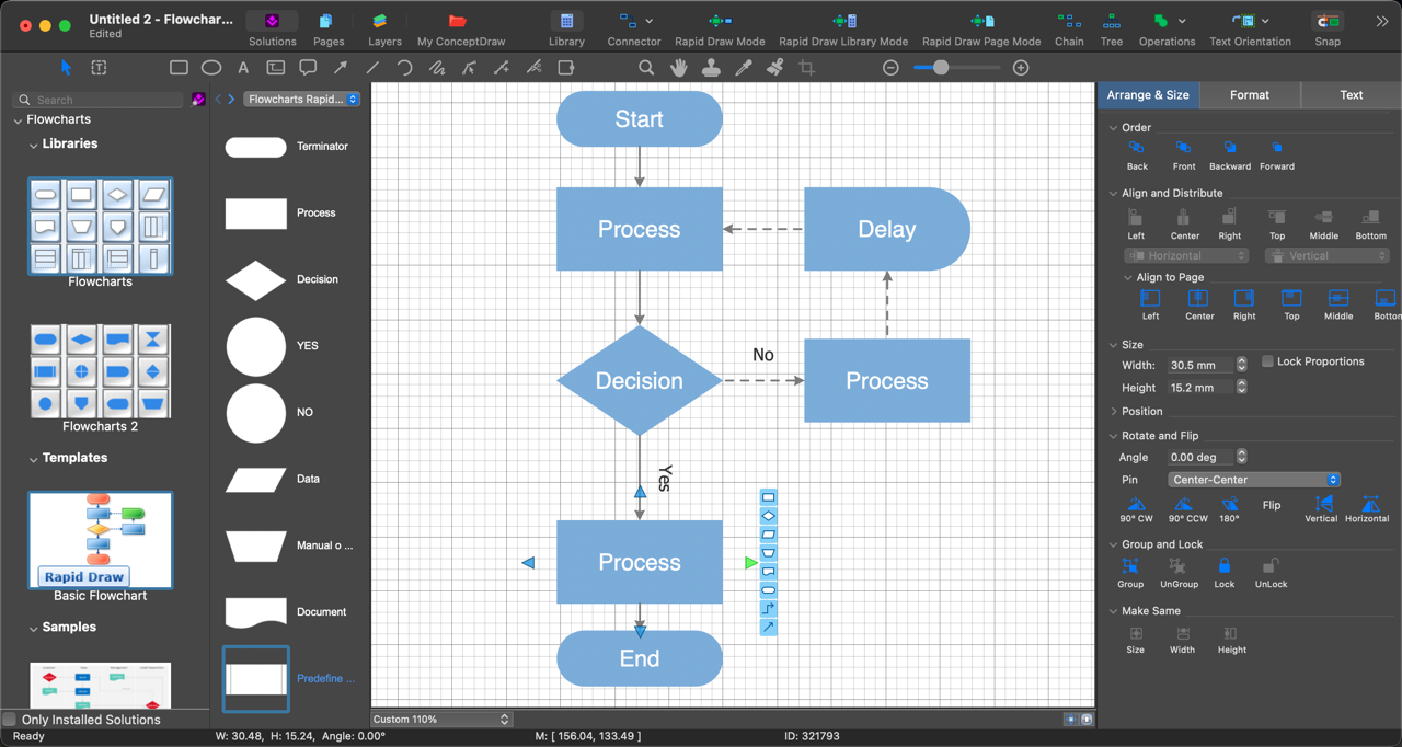 ConceptDraw DIAGRAM provides a set of tools enabling diagrams creating faster than ever. It takes a few minutes even for an inexperienced user to create a diagram using vector object libraries. The set of powerful drawing tools help to automate routine operations with multiple objects and allow one to quickly layout objects properly. The Rapid Draw tools make the short work of creating diagrams. By using Rapid Draw objects, you can quickly add, connect, and arrange a large group of objects with a few clicks. Using these tools will accelerate notably designing of Business Process Diagrams, Process Flowcharts and UML diagrams.