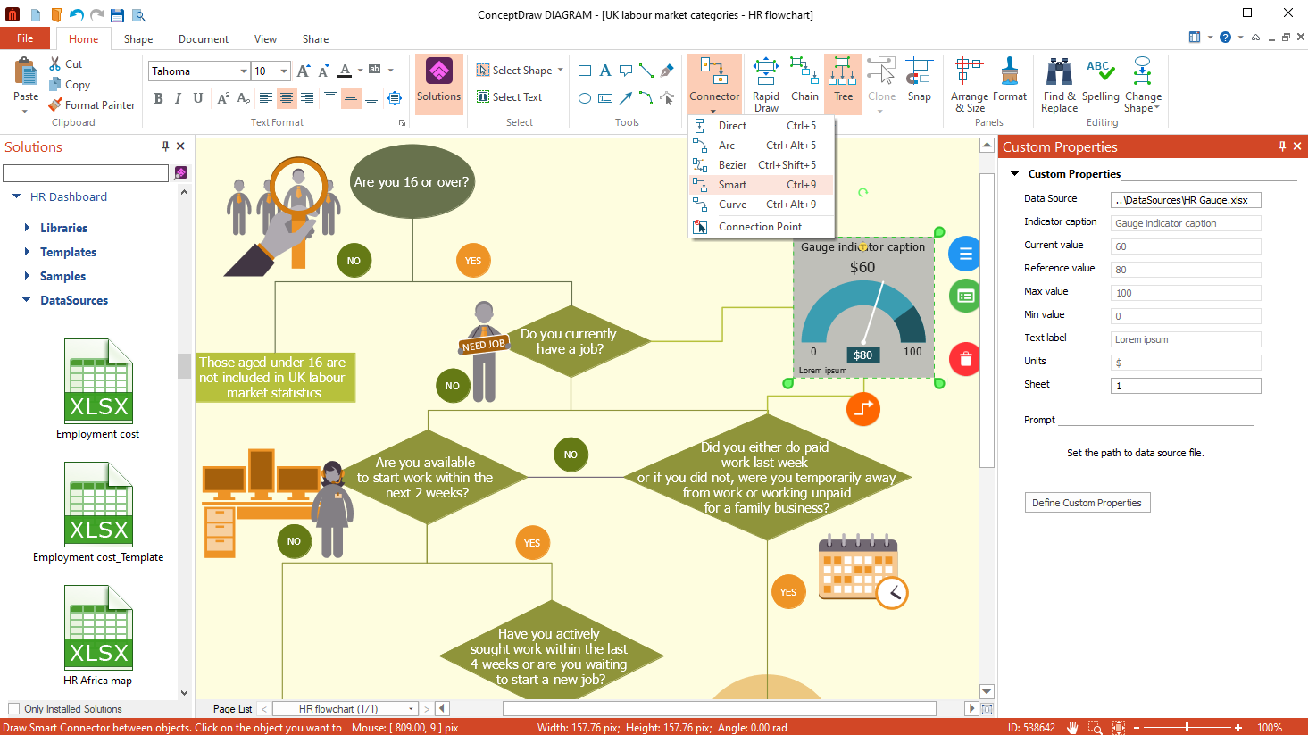 ConceptDraw DIAGRAM’s libraries contain a number of special Live Objects including transforming, switching, and data-driven objects. Any Live Object’s appearance can be changed manually or in response to external data. The Smart Connectors tool allows you to create and modify connections. Their behavior depends on the connector's type (Direct, Smart, Curve, Round, Bezier, or Arc). You can flip between them dynamically. The Chain and Tree modes provided automatic object connection. An ordinary graphic object can be turned into a sophisticated Live Object and any object can be transformed into a connector.
