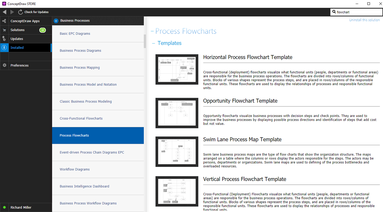 Identify the flow chart template you want to base your drawing on. Many templates are available in ConceptDraw STORE, including the Rapid Draw template.