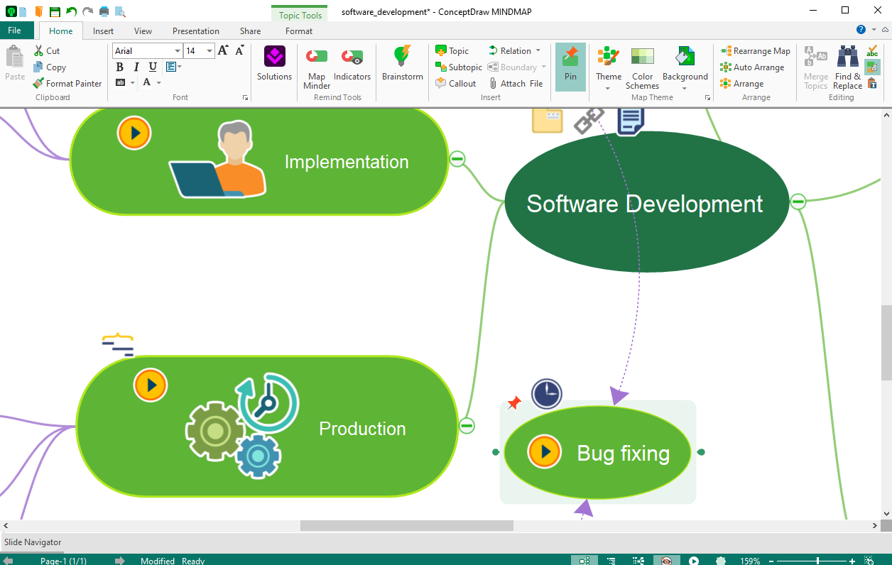 When creating mind map, we may need to draw the viewer's attention to particular items (topics, subtopics, images) and we would like them to be located in a certain place. The Pin Tool allows you to lock mind map elements from moving relative to the Main Idea.