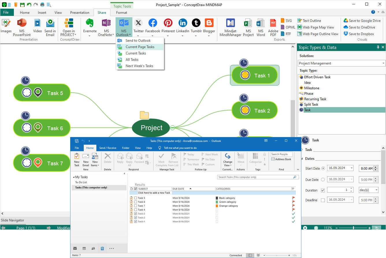 Export to Outlook (Windows) improved: Now if a topic is marked with a color icon and/or Priority stars (for a project task), this information will be displayed by Outlook in the Category and Priority fields.