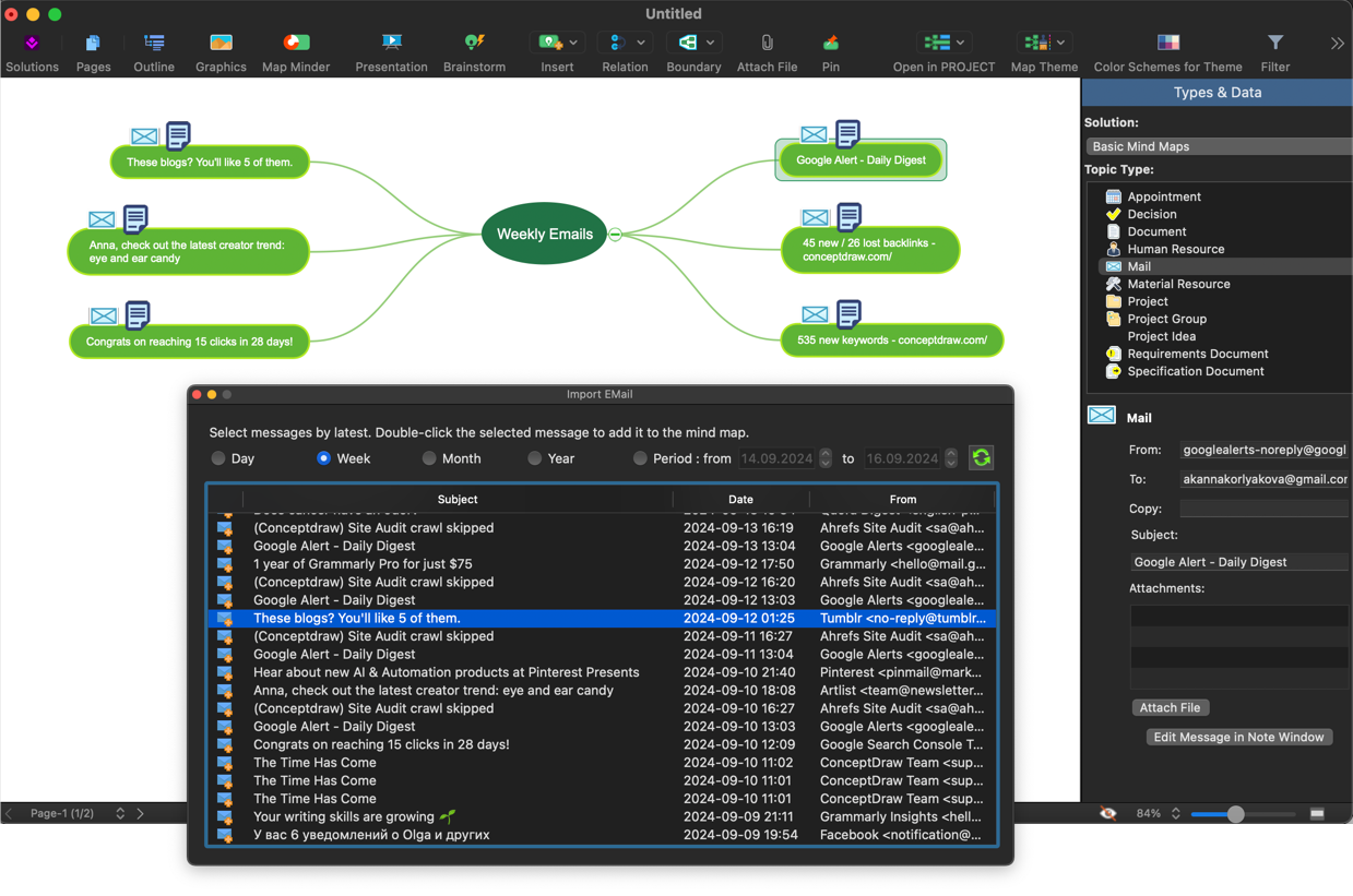 Import from Mail (macOS) improved: Added the ability to set time frames for imported messages. It helps to convert communication into actionable insights and structured knowledge. The ability to select messages to be imported enables users to better organize, understand, and take action on complex email content.