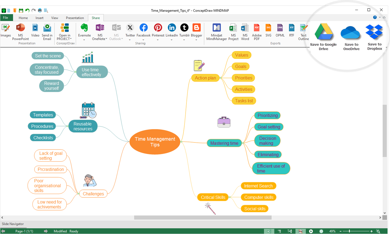 Integrations with Google Drive, MS OneDrive, and Dropbox have been added. Users can upload ConceptDraw MINDMAP files to their preferred cloud-based storage. Enhanced integration with various cloud-based apps boosts collaboration and improves project management and business productivity.