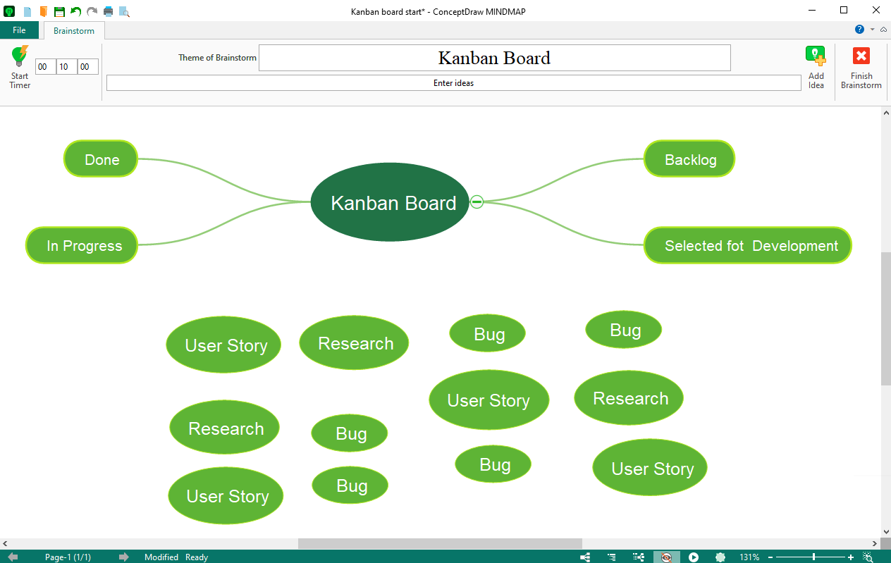 ConceptDraw MINDMAP provides the Kanban arrangement tool that helps create a Kanban board style mind map in a single click. Using Kanban arrangement tool enables one to visualize project workflow, analyze and improve business processes in line with Kanban method. The common columns on a Kanban board are Backlog, Selected for Development, In Progress, and Done.