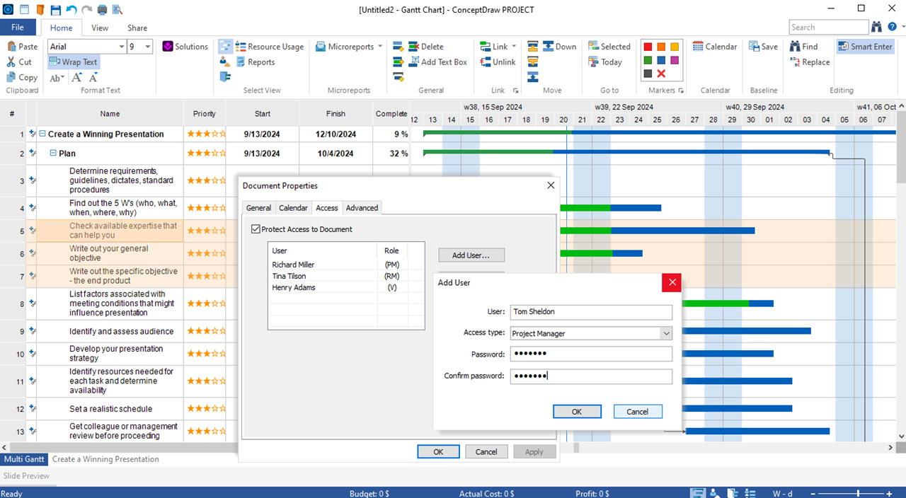 ConceptDraw PROJECT allows you to assign three levels of access to a document: