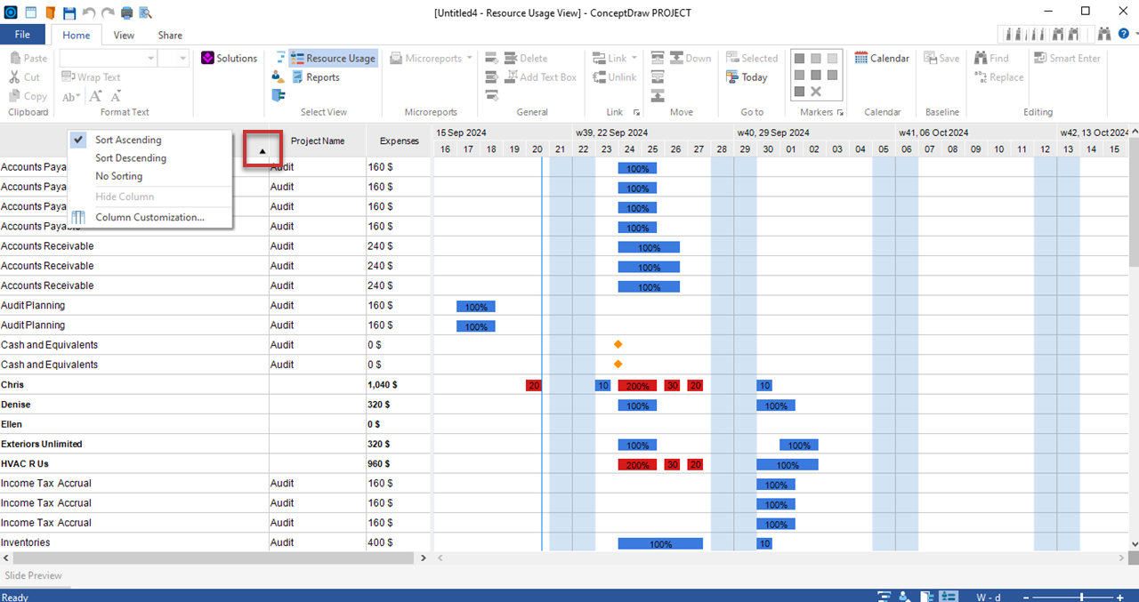 Resources can now be sorted alphabetically in Resource and Resource Usage tables. Project managers and other project participants have more freedom to customize the project file to focus on specific data.