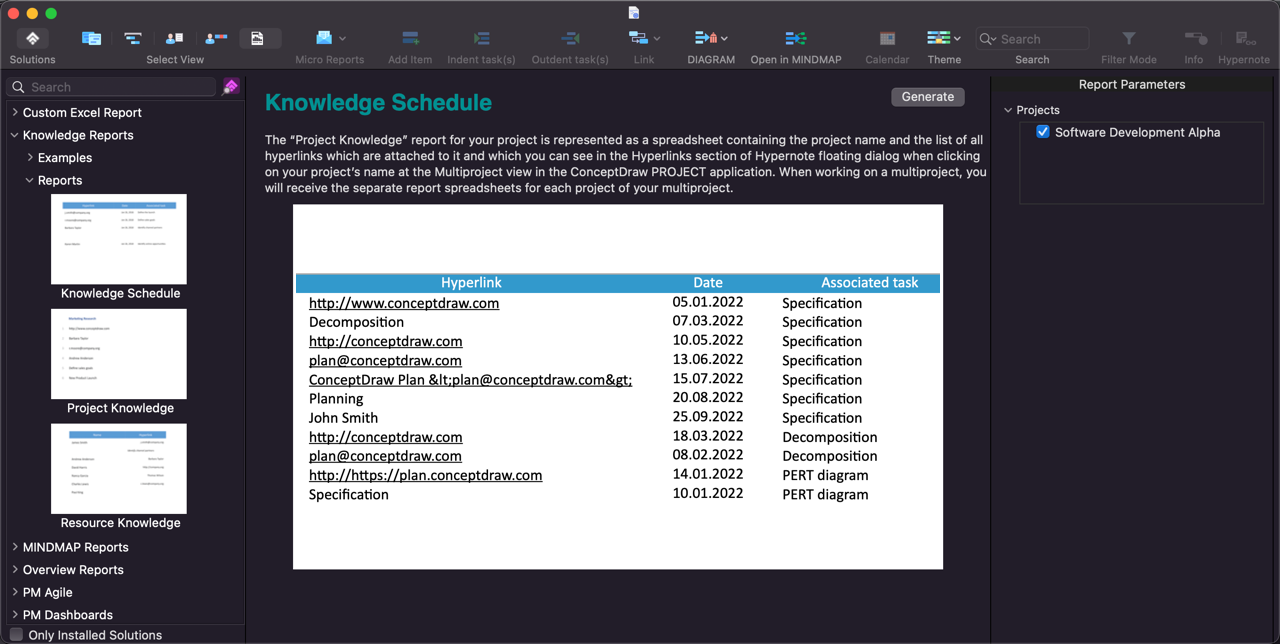To keep project accumulated knowledge inside the organization is an important competitive goal because the knowledge that has been accumulated throughout the project life cycle is an important competitive asset that can be leveraged for future projects. ConceptDraw PROJECT allows people to do their work by simply hyperlinking developed documentation to the appropriate task. The incentive to follow the hyperlinking procedure is for all team members to have a dashboard view of the project knowledge readiness. This dashboard is a visual indicator of potential documentation gaps in the project, which then leads to corrective action. This accumulation of documentation over the life of the project is a very tactical approach that requires no additional work by the team and the resulting outcome has a strategic impact for future projects.