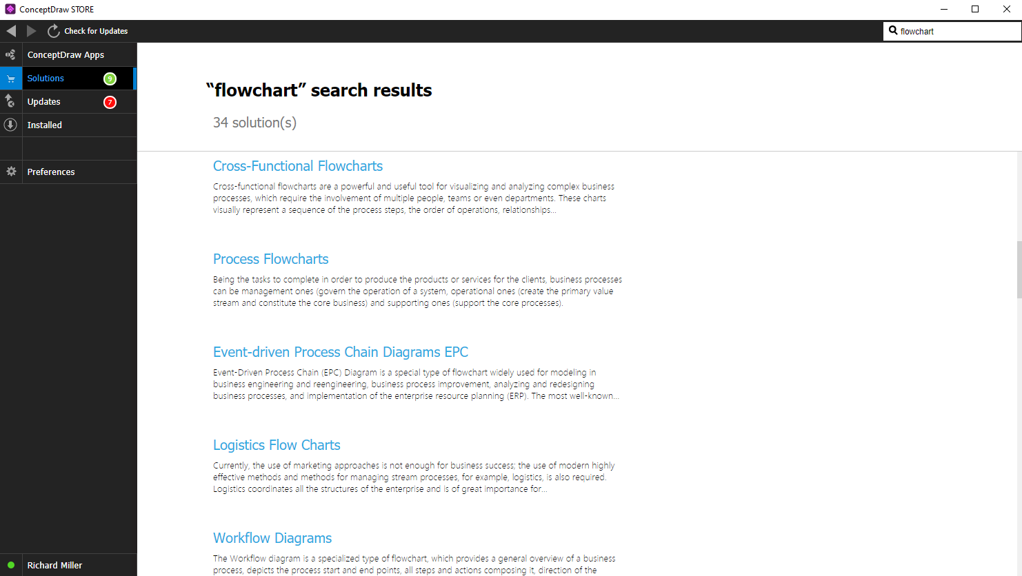 ConceptDraw STORE is a platform to discover, download and update ConceptDraw software and solutions. STORE is a nice piece of software responsible for delivering professional content to our customers. It contains a variety of business solutions from building plans to infographics. An ever-growing array of structured business graphic documents is accessible in the ConceptDraw STORE. It is always up-to-date and opened to external solutions. The latest update of ConceptDraw STORE brings you advanced search capabilities of the required solutions and products, as well as improved application management capabilities.