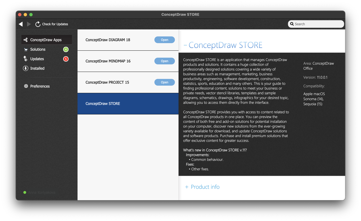 ConceptDraw STORE is an application that provides users with access to all ConceptDraw software and Solutions. It also notifies The user of ConceptDraw OFFICE about new releases and updates that are available for download and installation. ConceptDraw OFFICE 11 comes with STORE 11 compatible with the latest ConceptDraw products' major updates