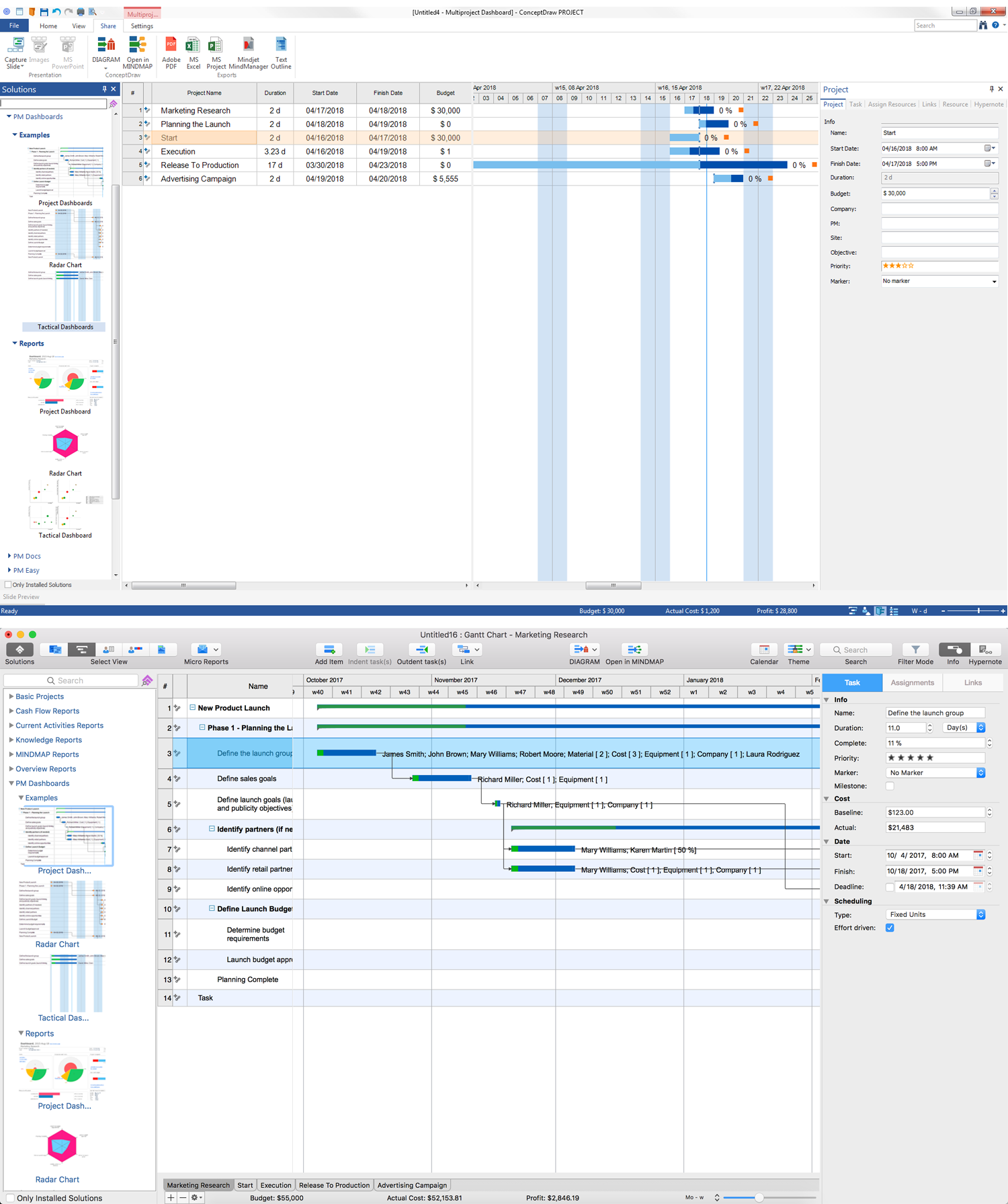 The mentioned features support all the ConceptDraw PROJECT application’s users in their work on the projects, including task and resource management work, reporting and controlling the changes that have to be done. The integration with the ConceptDraw Office suite may help to improve the overall project management. It can be done by using the power of mind mapping and data visualization features.