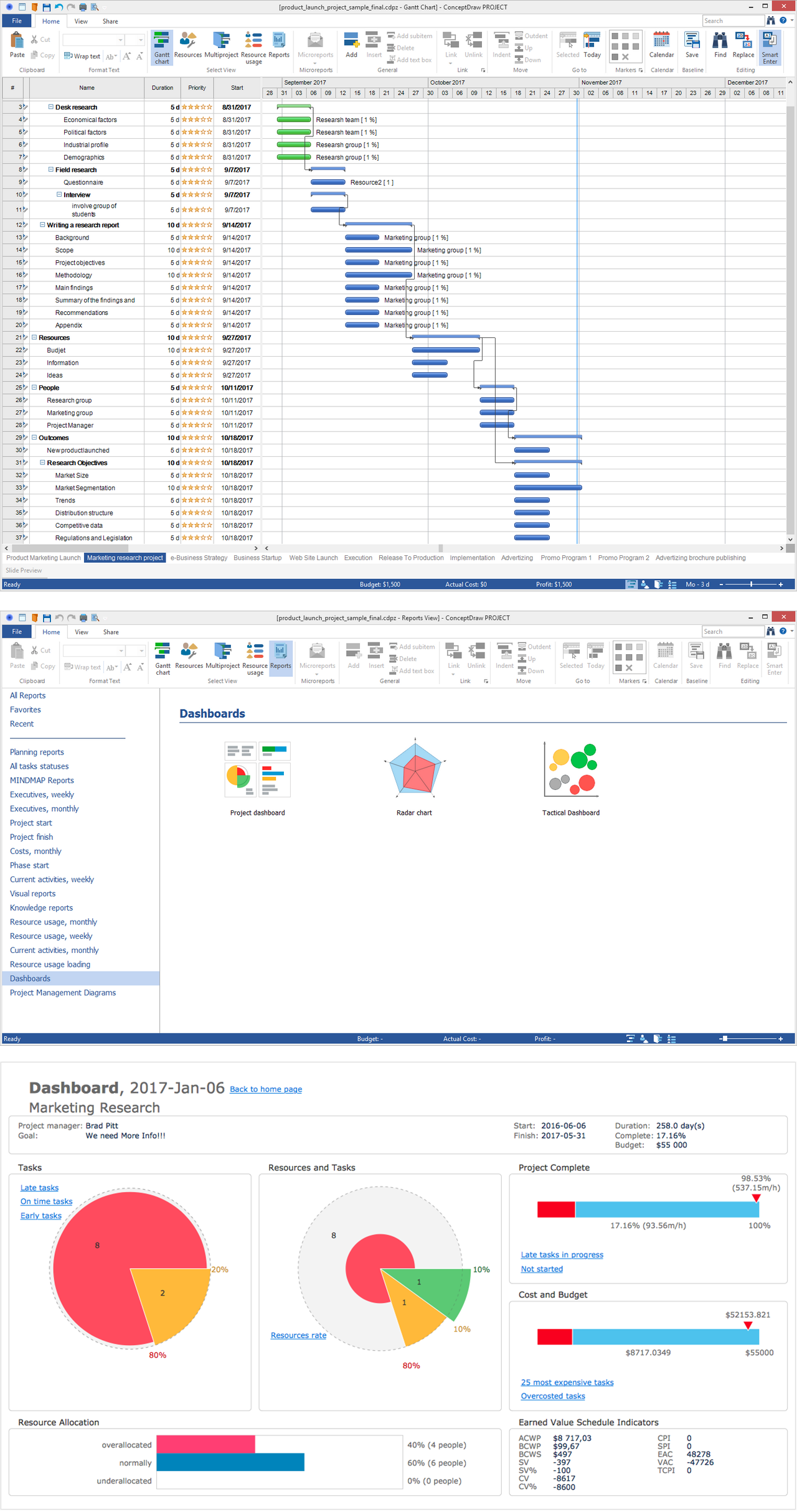 The dashboards created with the help of specialized tools of ConceptDraw PROJECT software are perfect for delivering a clear view about the project performance and progress to all project participants. ConceptDraw PROJECT allows generating three types of dashboard reports in ConceptDraw DIAGRAM document format, one of them is a Project Dashboard available for creation from the Dashboards section on the Reports toolbar. The Project Dashboard provides always relevant key information on the project and its current status on one report page. Therefore, it is helpful to define the future project's direction and the points that require the special management attention.