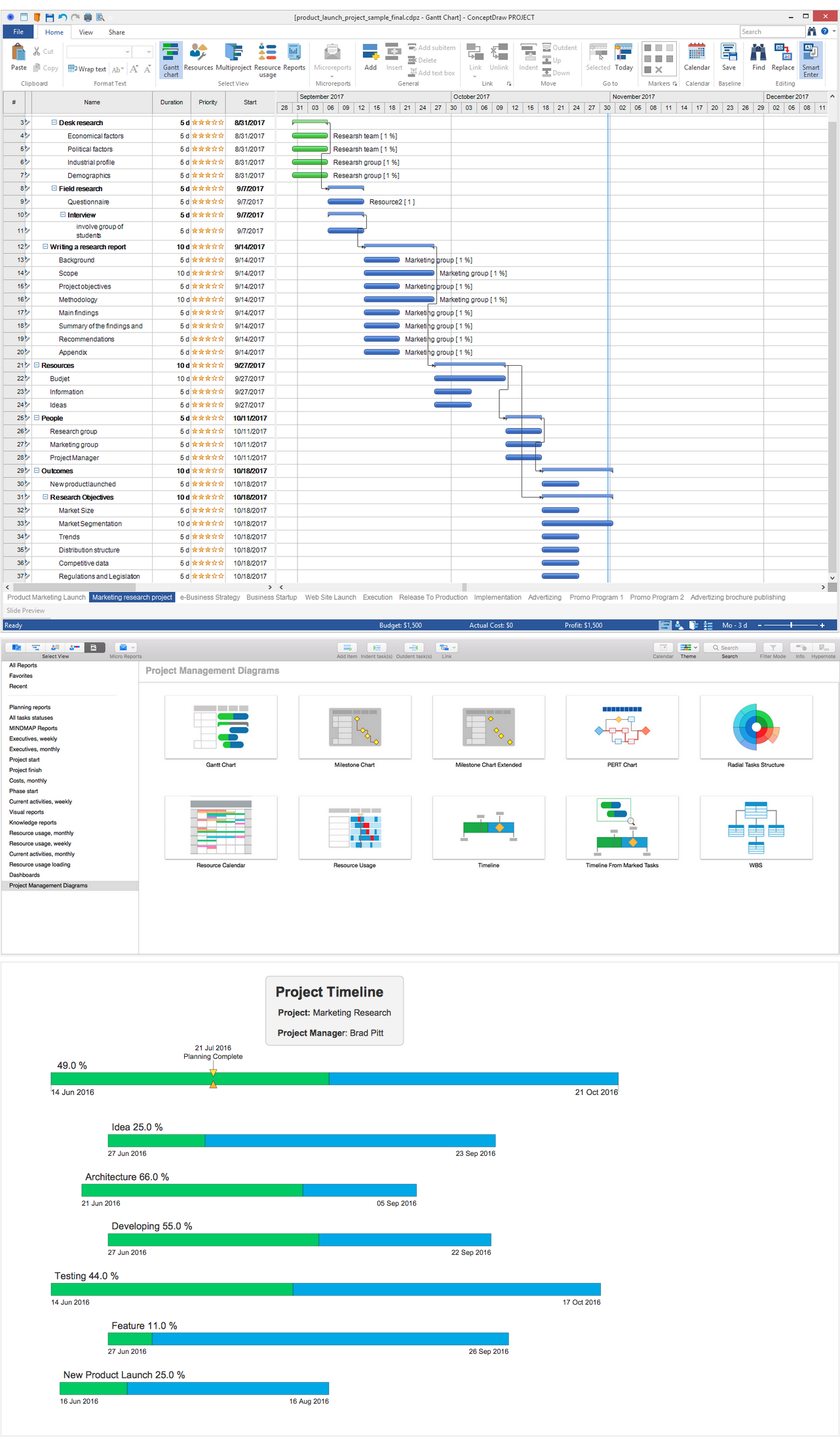 ConceptDraw PROJECT is a multifunctional software that gives its users the great abilities in a field of project management, it lets professionally construct the Gantt Charts for your simple projects and complex multi-projects, and perfectly suits for generating different types of reports, including the Timeline reports representing the whole project and Timelines from the custom marked tasks.