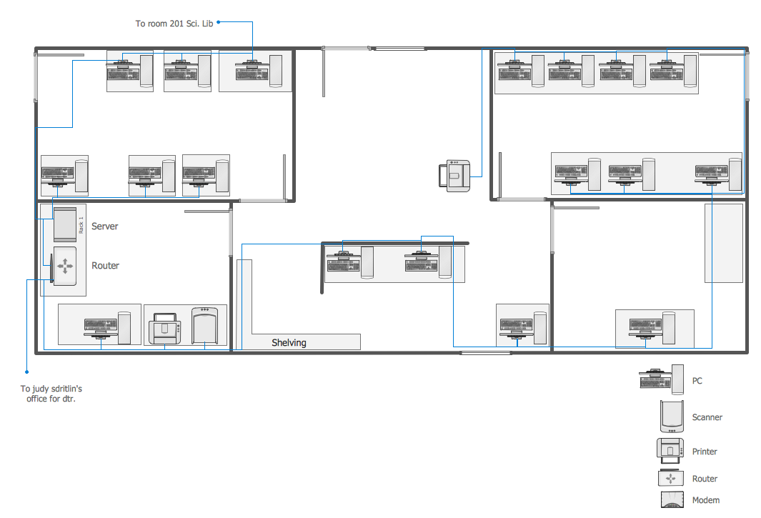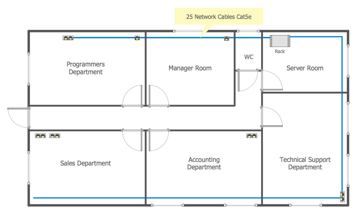Samples of network layout floor plans are created with ConceptDraw DIAGRAM diagramming and vector drawing software enhanced with Network Layout Floor Plan solution from ConceptDraw Solution Park.