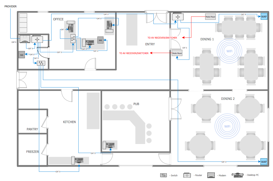 Network Layout Floor Plans sample: Restaurant network layout floor plan.
