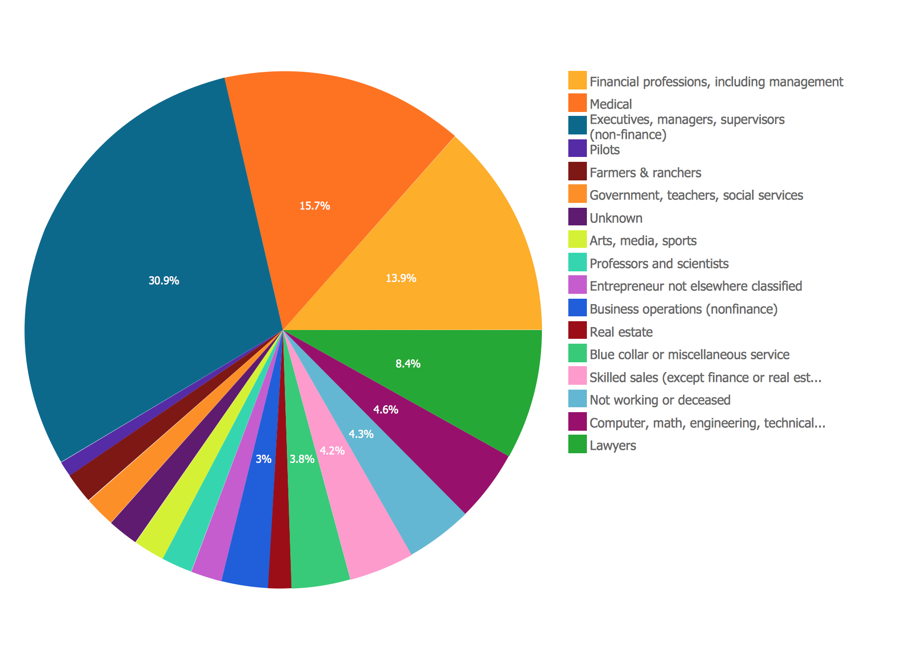 Pie Charts sample: Percentage of the Top 1% Wage Earners in the US by Occupation.
