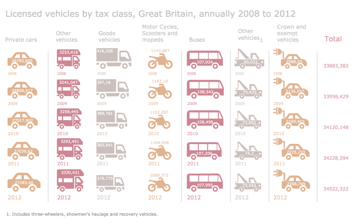 Pictorial Infographics sample: Licensed vehicles by tax class, Great Britain, annually - 2008 to 2012.