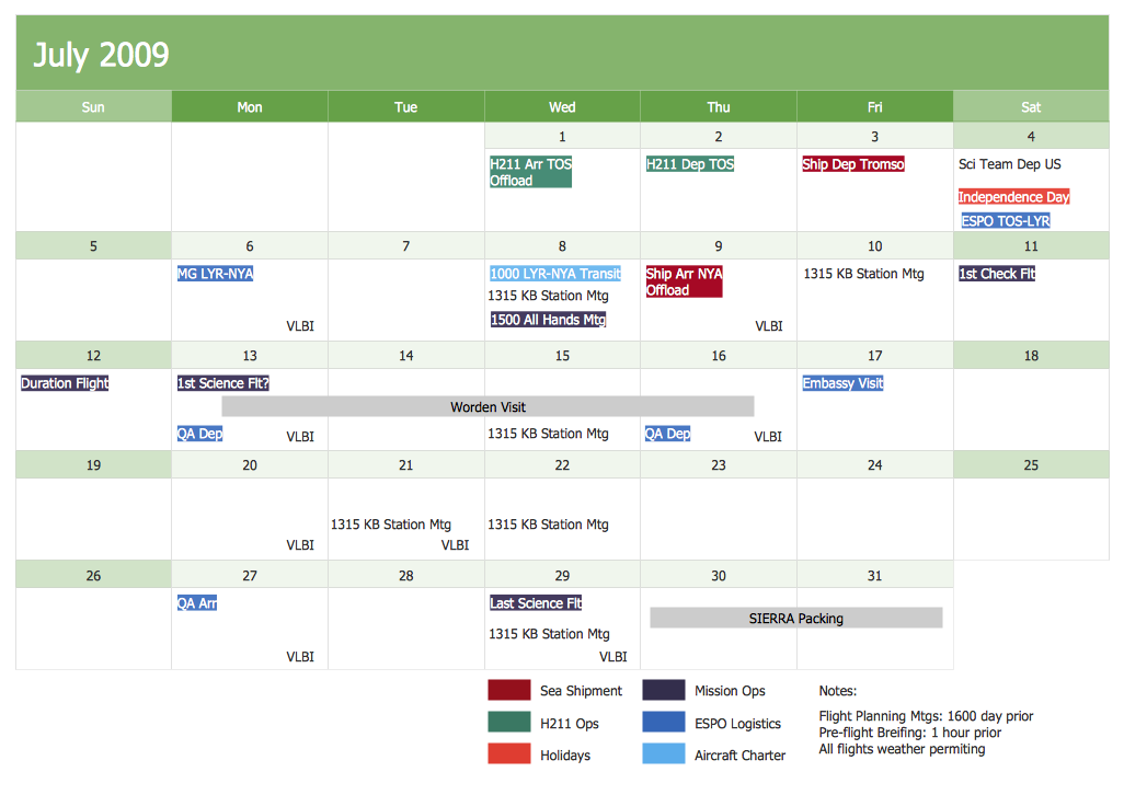 Calendars sample: NASA ESPO CASIE mission schedule July 2009.
