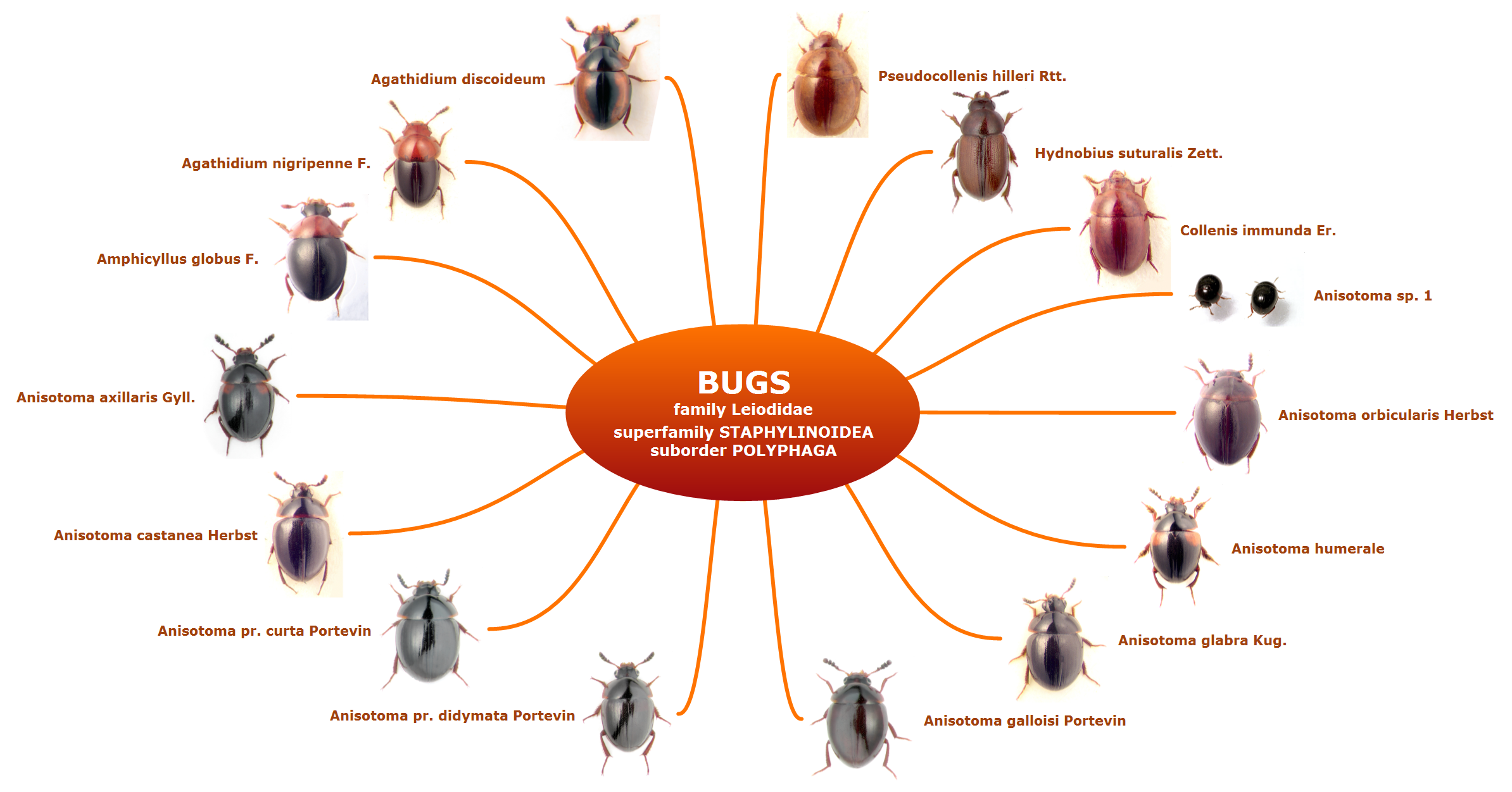 Biological mindmap sample: Bugs. Suborder Polyphaga. Superfamily Staphylinoidea. Family Leiodidae.