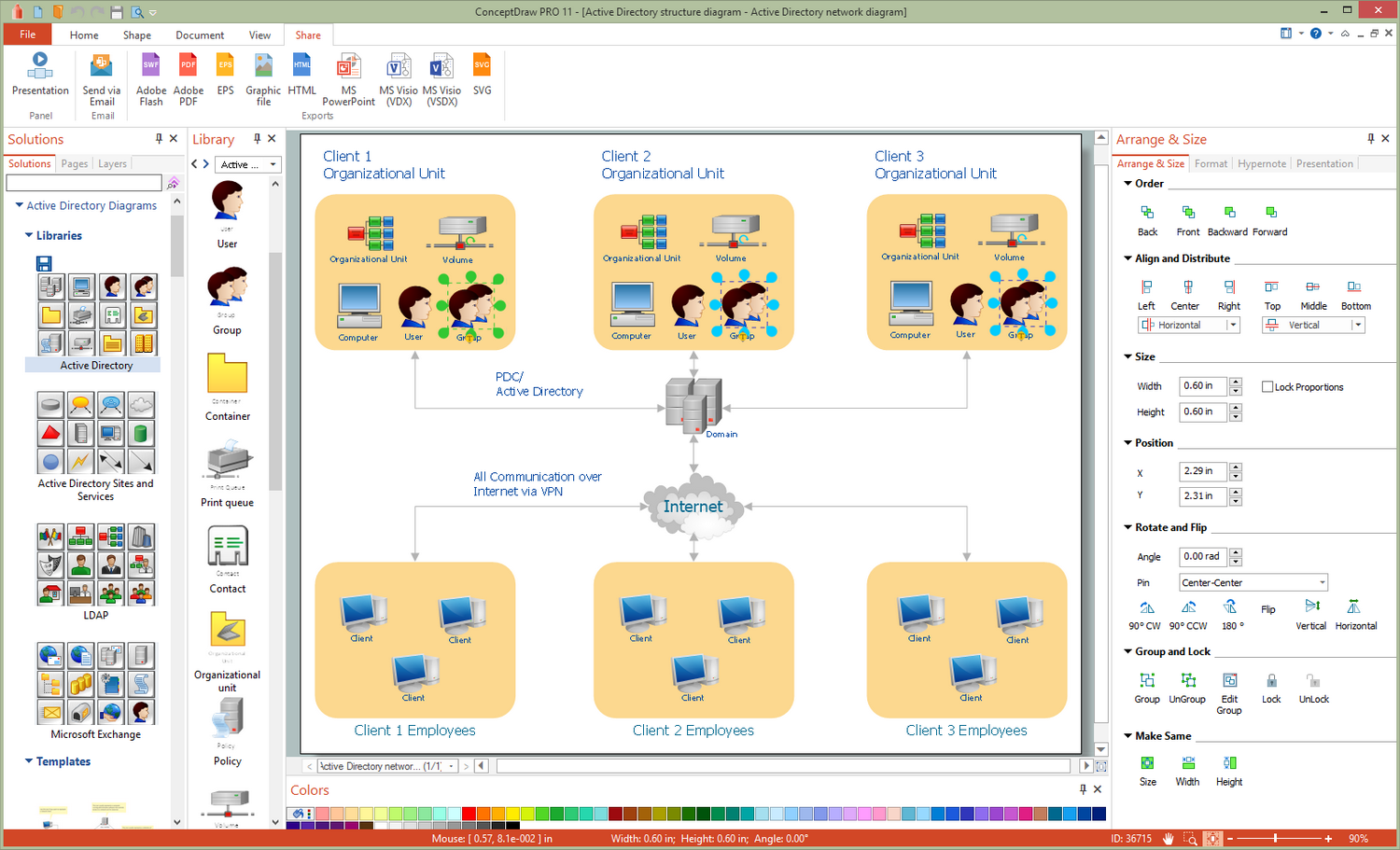 By using software such as ConceptDraw DIAGRAM, and extending it with the Active Directory solution, administrators have a workspace in which to create detailed, industry standard diagrams, that provide a clear overview of network structure in a visual manner. Vector stencil libraries included with the solution offer iconography for all possible elements and resources within a network, giving a limitless scope for design that can apply to any organizational structure.