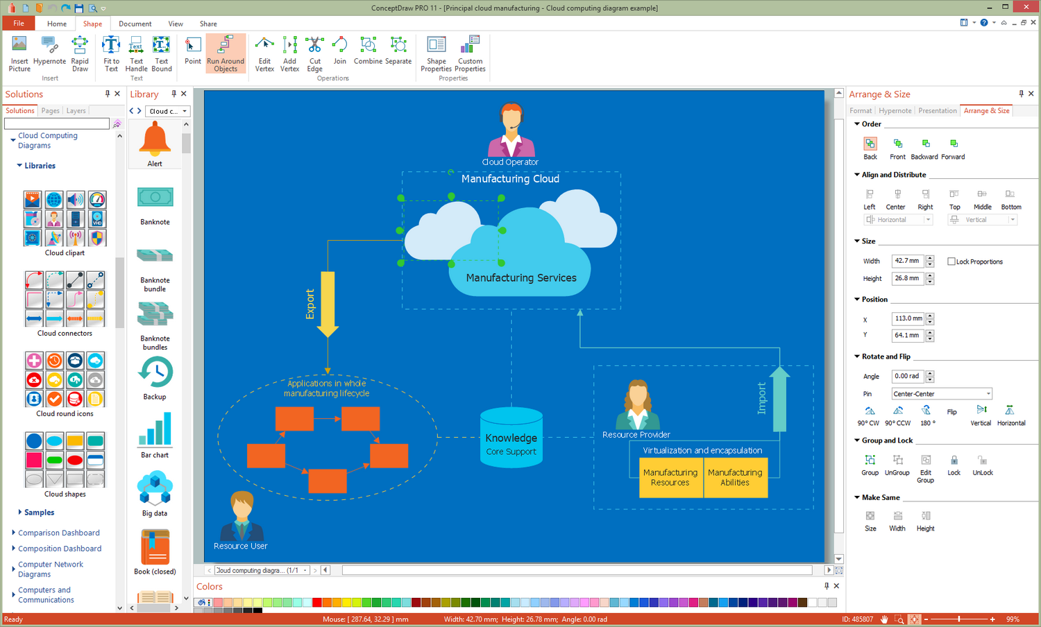 This diagram demonstrates the Principal cloud manufacturing and was created with the tools of ConceptDraw's Cloud Computing Diagrams solution on the base of the file from Wikimedia Commons licensed under Creative Commons Attribution-Share Alike 3.0 Unported license. The Cloud manufacturing (abbr. CMfg) is a manufacturing paradigm covering such advanced manufacturing models, technologies and concepts as a network manufacturing (NM), manufacturing grids (MGrid), virtual manufacturing (VM), agile manufacturing (AM), Internet of Things (IoT), service-oriented technologies, computing technologies, cloud computing and enterprise information technologies under the cloud computing support. The cloud manufacturing is a model of a universal and convenient access to the general pool of manufacturing resources and manufacturing capacities, which are turned into the cloud services and are managed centrally so that in a moment the clients can use them at their discretion. The undoubted advantage is that the Cloud manufacturing is able to provide the high-quality, low-cost, reliable, and secure manufacturing services for the entire manufacturing life cycle.