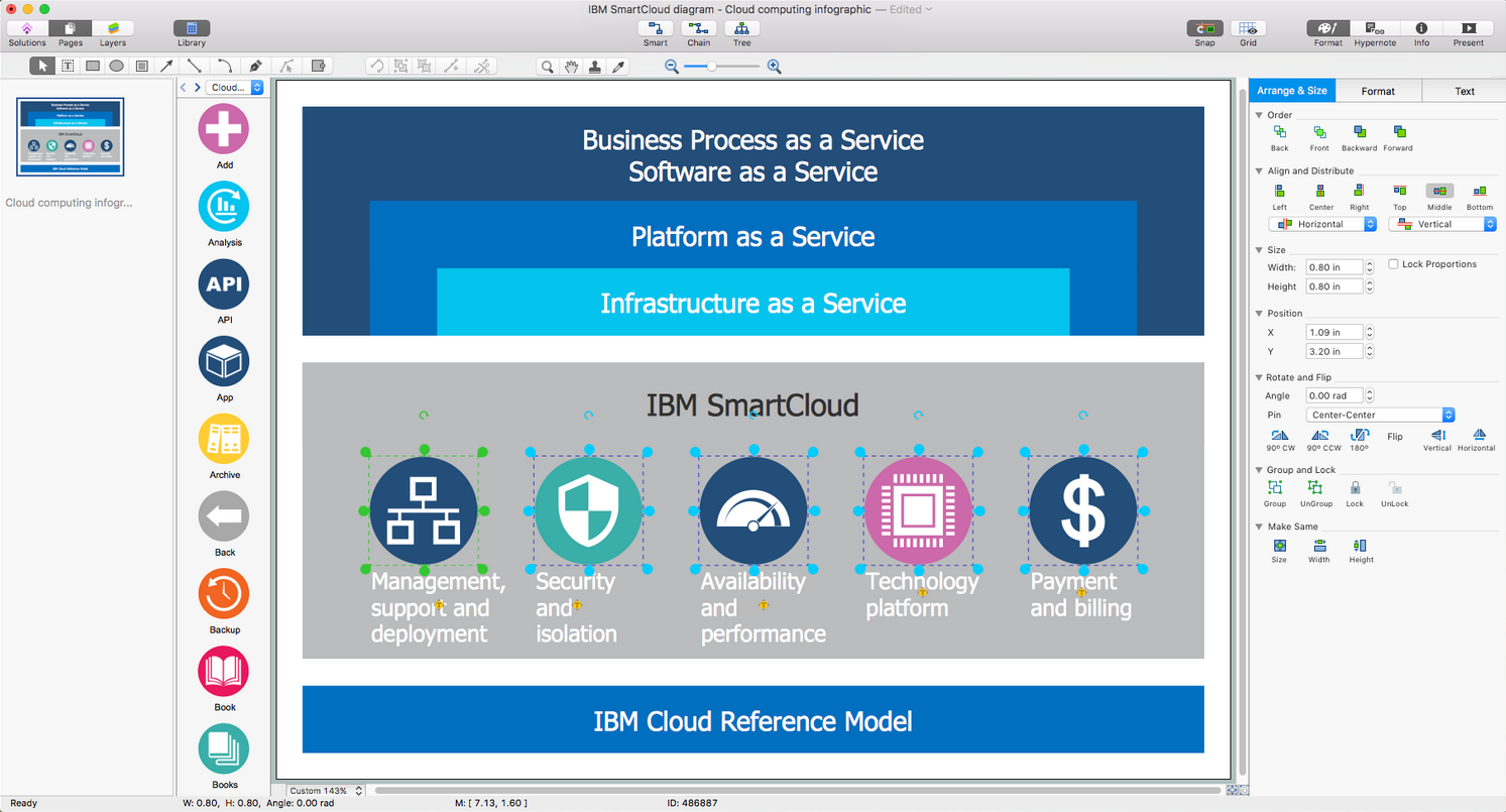 This diagram visually demonstrates the structure and components of the IBM SmartCloud, which is a kit of cloud computing services developed by IBM company and intended for business. The IBM SmartCloud computing services allow its customers to store, to find and to extract their data, to protect them, and to recover important information in minutes in case of some emergency. The IBM Cloud is delivered by public, private or hybrid models and contains the IaaS (Infrastructure as a service), SaaS (Software as a Service) and PaaS (Platform as a service). Since 2011 the IBM cloud service is used successfully equally with similar AWS (Amazon Web Services), Rackspace, and other large cloud platforms. Designing this SmartCloud Model or any other Cloud computing model you may not think about the need of special painting or designing skills, because everything you may require to draw professional diagrams, you already have within the ConceptDraw's Cloud Computing Diagrams solution.