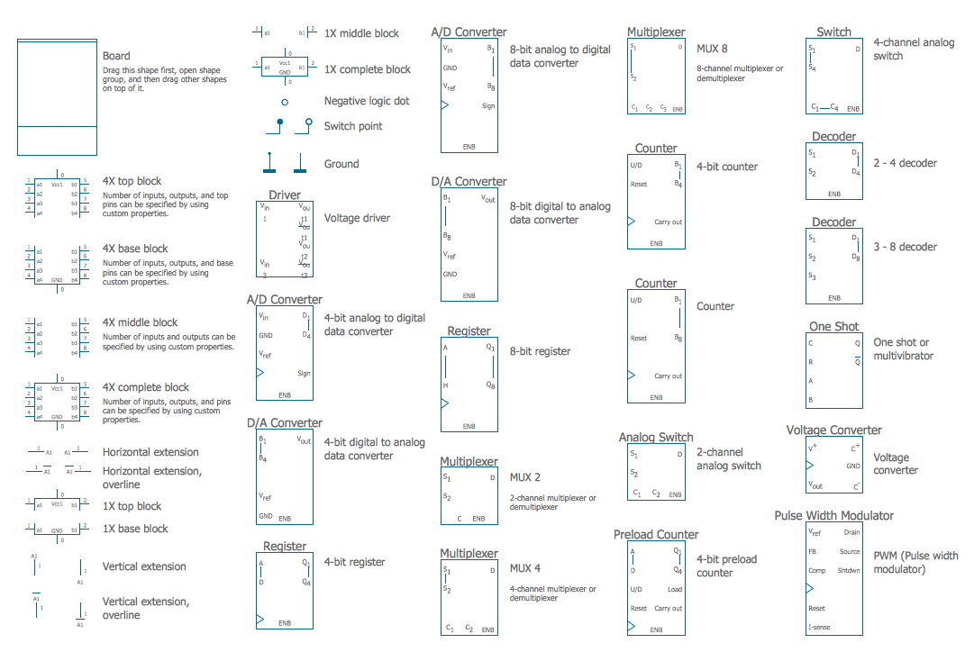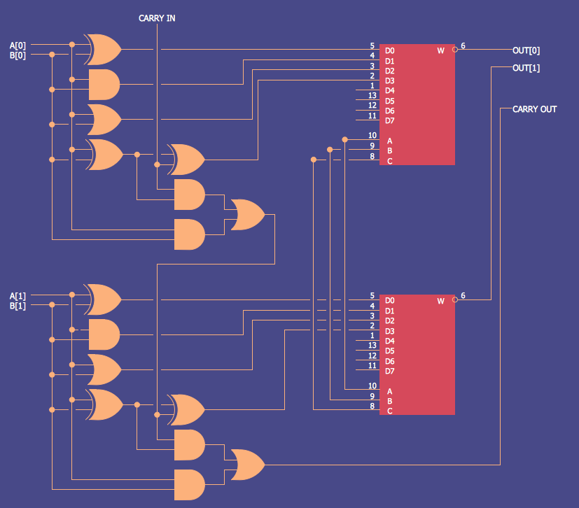 This sample shows the electrical diagram of a 2 Bit ALU (Arithmetic Logic Unit). You need to draw a 4 Bit ALU, 16 Bit, or 32 Bit? The Electrical Engineering Solution will add value to your ALU! It offers all the predesigned electrical schematic symbols and electrical diagram symbols you could need.