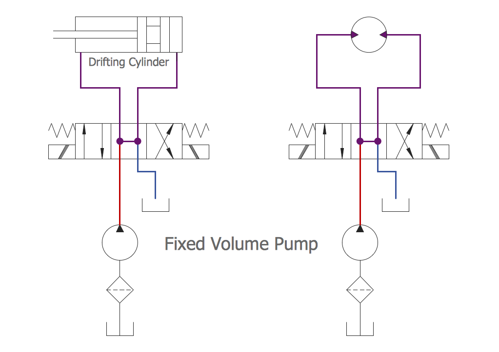 This diagram was created in ConceptDraw DIAGRAM using the Fluid Power Equipment, Fluid Power Valves, and Hydraulic Pumps and Motors Libraries from the Mechanical Engineering Solution. An experienced user spent 5 minutes creating this sample.
