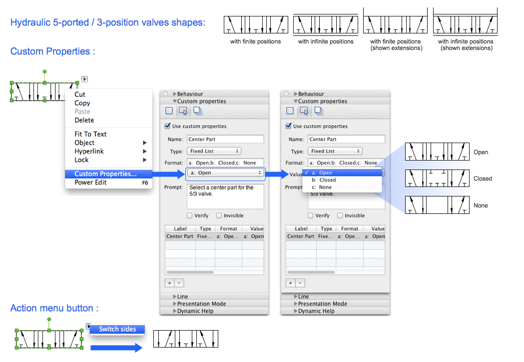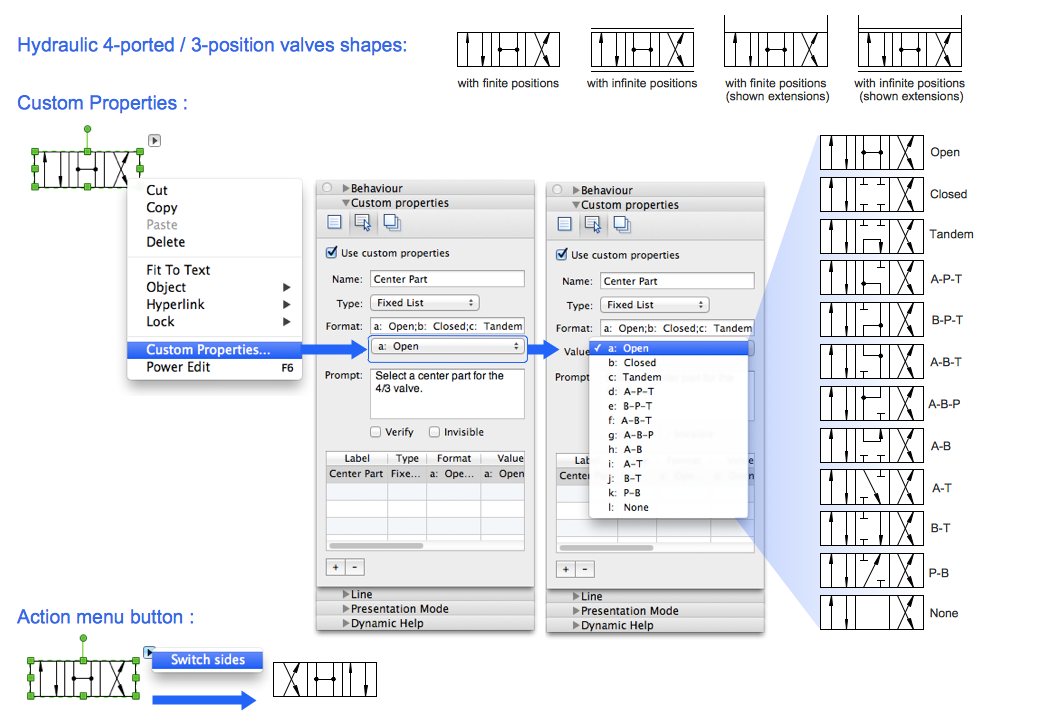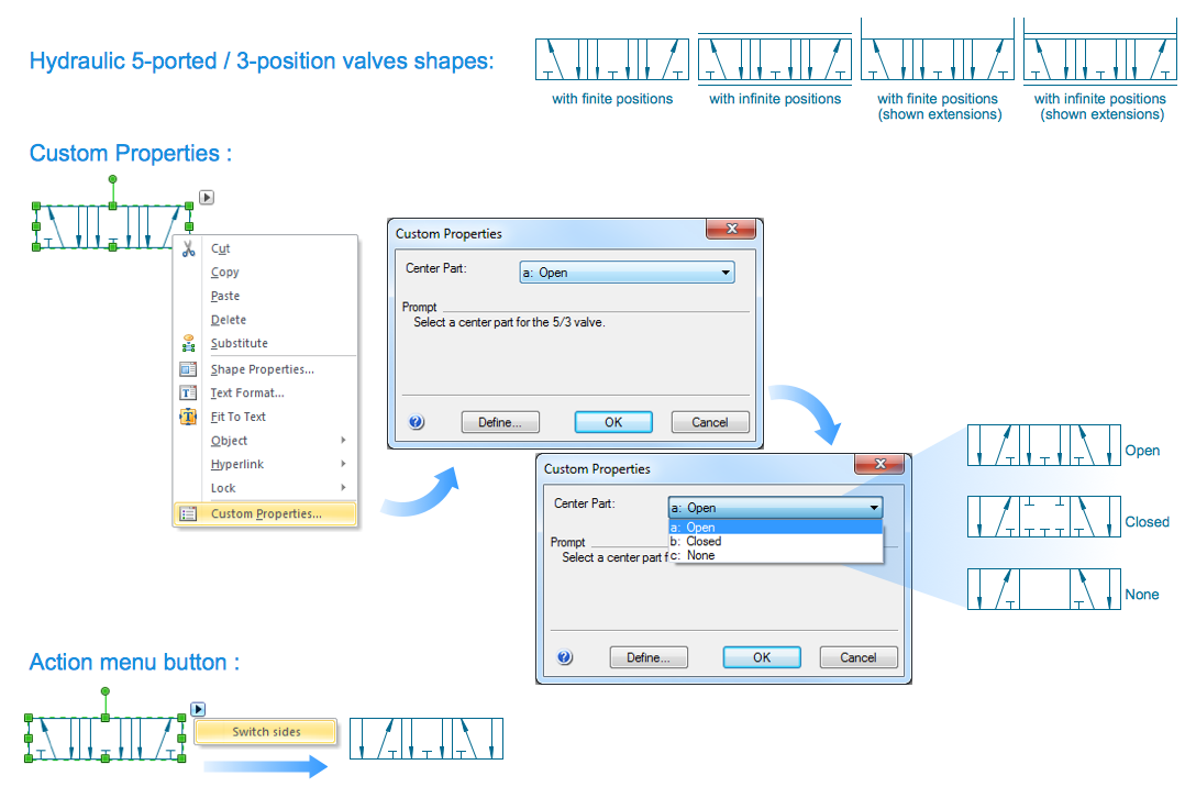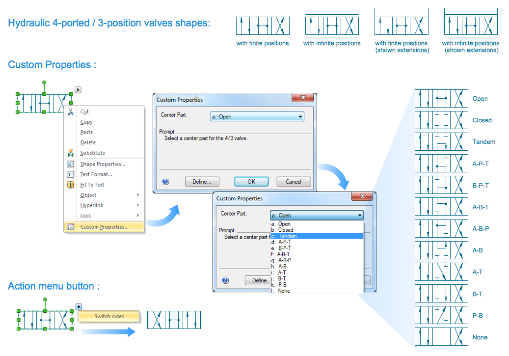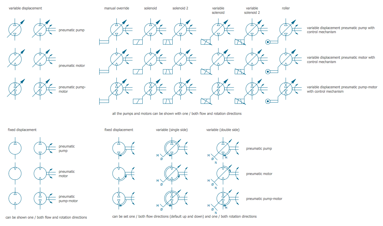 This sample visualizes a Directional Control Valve. Directional control valves are the main parts in hydraulic and pneumatic machinery. It’s important to draw their schemes attentively. The mechanical design software of ConceptDraw DIAGRAM will help you.