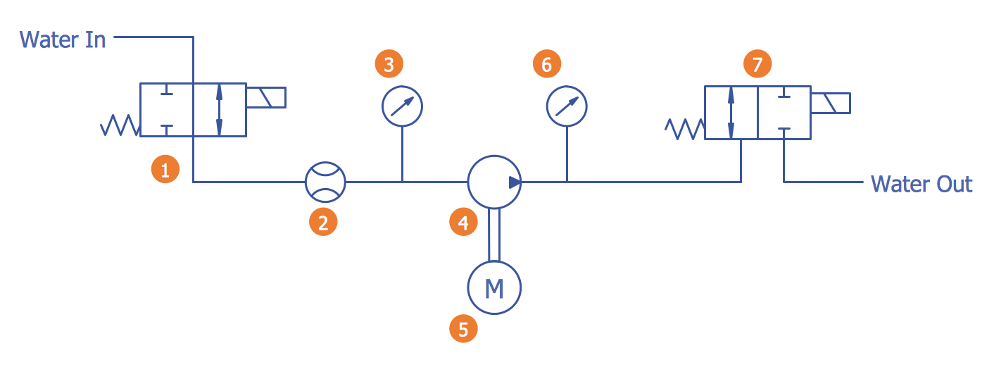 This sample illustrates the simple hydraulic schematic of apparatus required for testing the strength of a hydraulic hose splice. You can see how the water passes; the components of system are indicated by numbers. For clarity you can also add a legend which explains what each number designates.