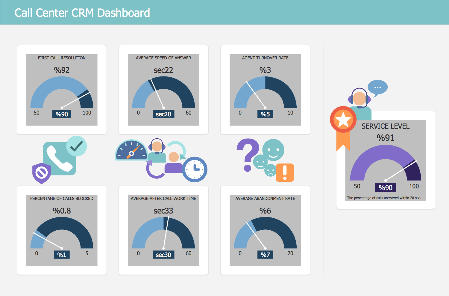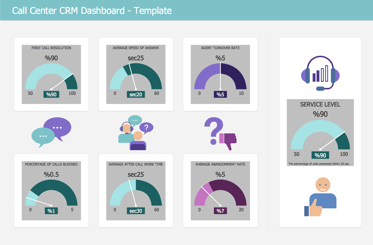 This template represents the Call Center CRM Dashboard with 7 indicators of business metrics and KPIs. All metrics are depicted with help of ConceptDraw's Gauge indicators live objects, the connected data source file is represented by seven-page Excel document. The indicators have their own scales and default values. The list of call center customer service metrics includes: First Call Resolution with default value 90%, reference value 90% and scale 50-100%; Service level, which default value is set 90%, reference value 90%, scale 50-100%; Agent Turnover Rate that has 5% default value, 5% reference value and scale 0-10%; Average Speed of Answer with default value set 25 sec, reference value 20 sec, scale 0-60 sec; Percentage of Calls Blocked, default value of which is 0,5%, reference value 1%, scale: 0-5%; Average After Call Work Time with default value 25 sec, reference value 30 sec, scale 0-60 sec; Average Abandonment Rate indicator has 9% default value, 7% reference value, and scale 0-20 %.