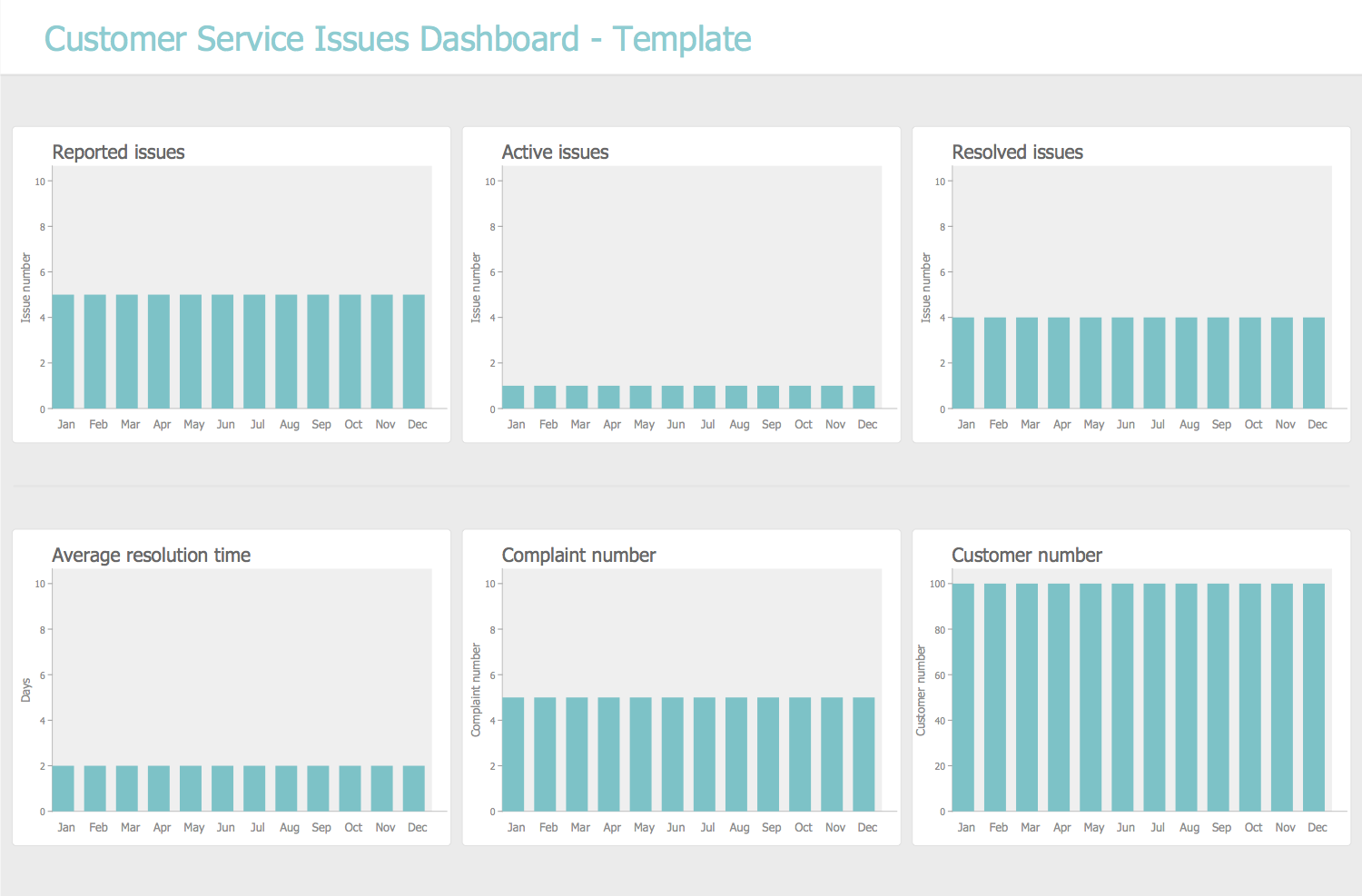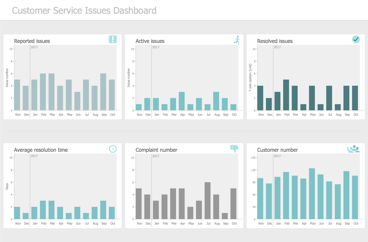 This sample represents the Customer Service Issues Dashboard designed with help of ready-to-use vector objects from the libraries of ConceptDraw’s CRM Center Dashboard solution. On one ConceptDraw document page are arranged 6 Column Charts illustrating the values of Customer Service Issues KPIs for the last 12 months (including the current month). Among these KPIs are: Active Issues that shows the number of active or unresolved problems and complaints of users for the month; Resolved Issues that shows the number of resolved issues and complaints of users for the month; Reported Issues that depicts the combination of two previous indicators (Active Issues and Resolved Issues); Average Resolution Time that represents the average time of resolution the problem or claim for the month; Complaint Number that depicts the total number of claims for the month; and Customer Number that shows the number of buyers per month. All diagrams are represented in a unified color style, which make this document professional looking and successful.