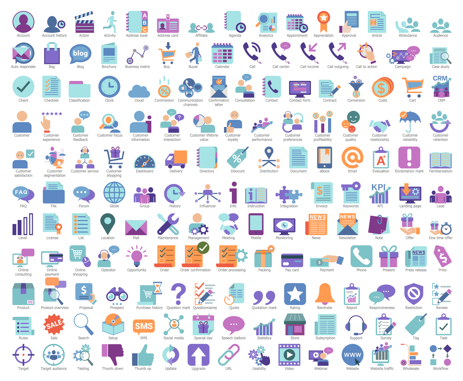 There are 5 stencil libraries containing 192 vector objects and pictograms in the CRM Center Dashboard solution.