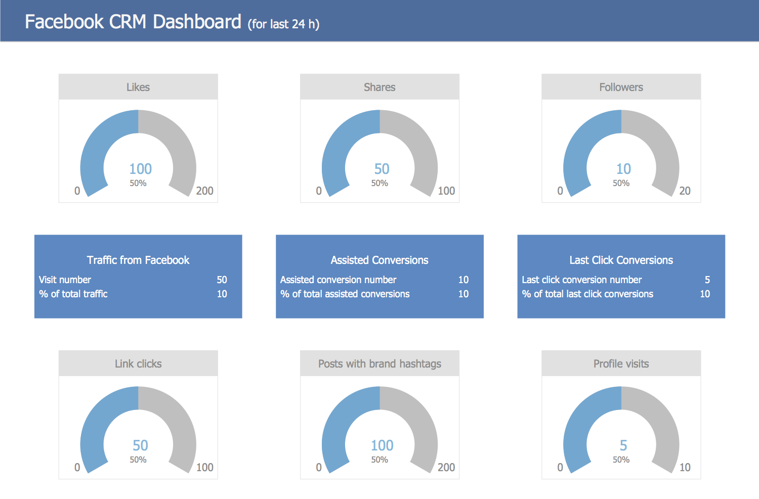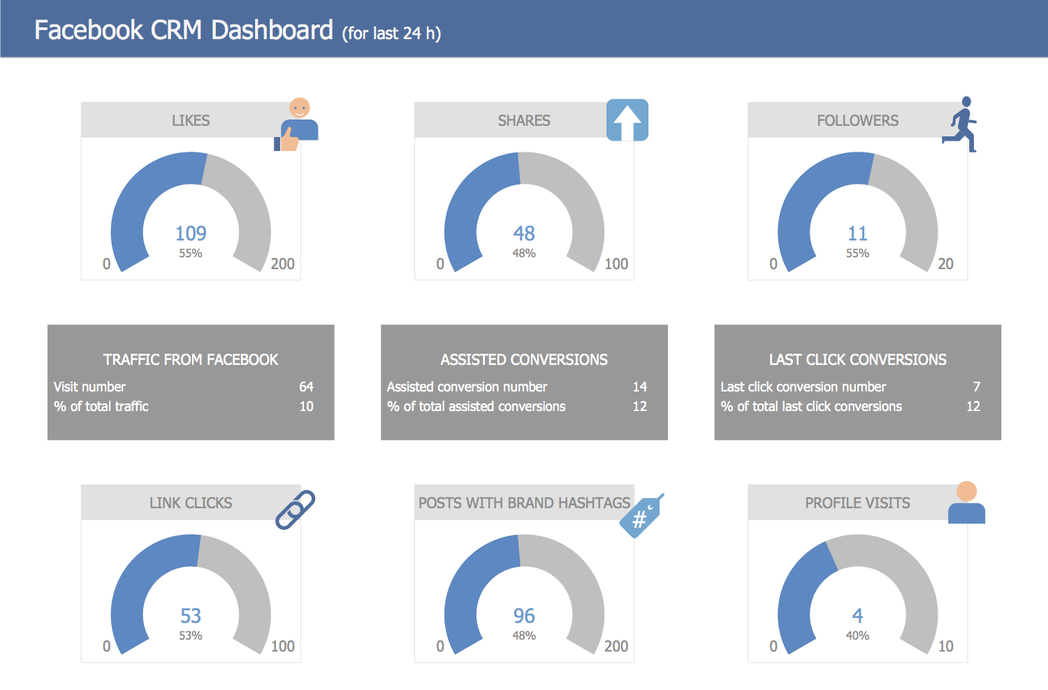 This sample illustrates Facebook CRM Dashboard and includes six ConceptDraw’s vector live objects of Arc Indicators: Likes depicting the quantity of received likes for the last 24 hours from 0 to 200 (on this sample equals 109); Shares shows the share number from 0 to 100 (on this sample it is 48); Followers representing the number of followers from 0 to 20 (11 here); Link Clicks illustrating the number of clicks on the company website hyperlink (53 on this sample); Posts with Brand Hashtags depicts the number of posts with company brand hashtags (96 here); Profile visits that represents the number of Facebook profile visits (equals 4 on this sample). Three indicators at the middle are represented by Multi Digital Value indicators: Traffic from Facebook shows the number of visits of Facebook company website and % of total website traffic; Assisted Conversions represents the number of assisted conversions and % of total assisted conversions; and Last Click Conversions depicts the quantity of last click conversions and % of total last click conversions. The attached source file is represented by Excel document with 9 pages which names correspond to the business metrics and KPIs.
