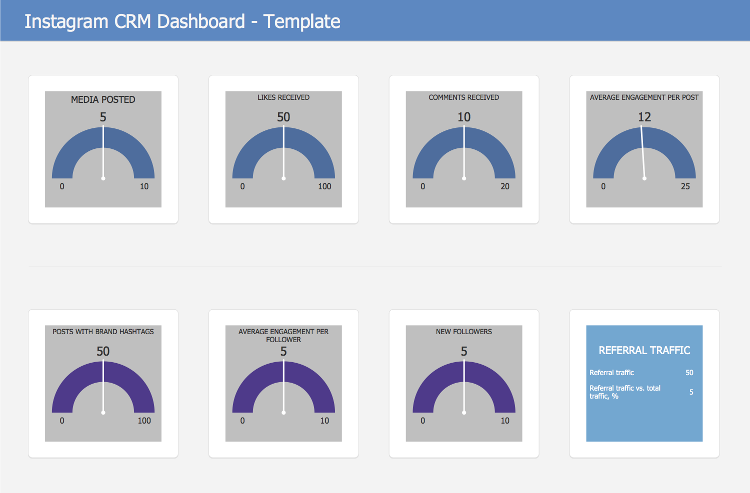 This template of Instagram CRM Dashboard includes the ConceptDraw live objects of Gauge indicators and Multi Digital Value indicator with default values of 9 metrics, which can be changed on the actual values for last 24 hours in any moment. You can set the number of posts on Instagram for last 24 hours (default value is 5); the likes received on the Instagram posts for last 24 h (by default 50); the quantity of comments received on Instagram posts for last 24 h (default value is 10); the average of likes and comments per post for last 24 h (by default 12); the quantity of posts with company brand hashtags (default value is 50); the average value of likes and comments per follower for last 24 h (by default 5); the quantity of new follower for the last 24 h(default value is 5); the quantity of traffic received by the company website from Instagram for last 24 h (by default Referral traffic equals 50 and Referral traffic vs. total traffic is 5%).