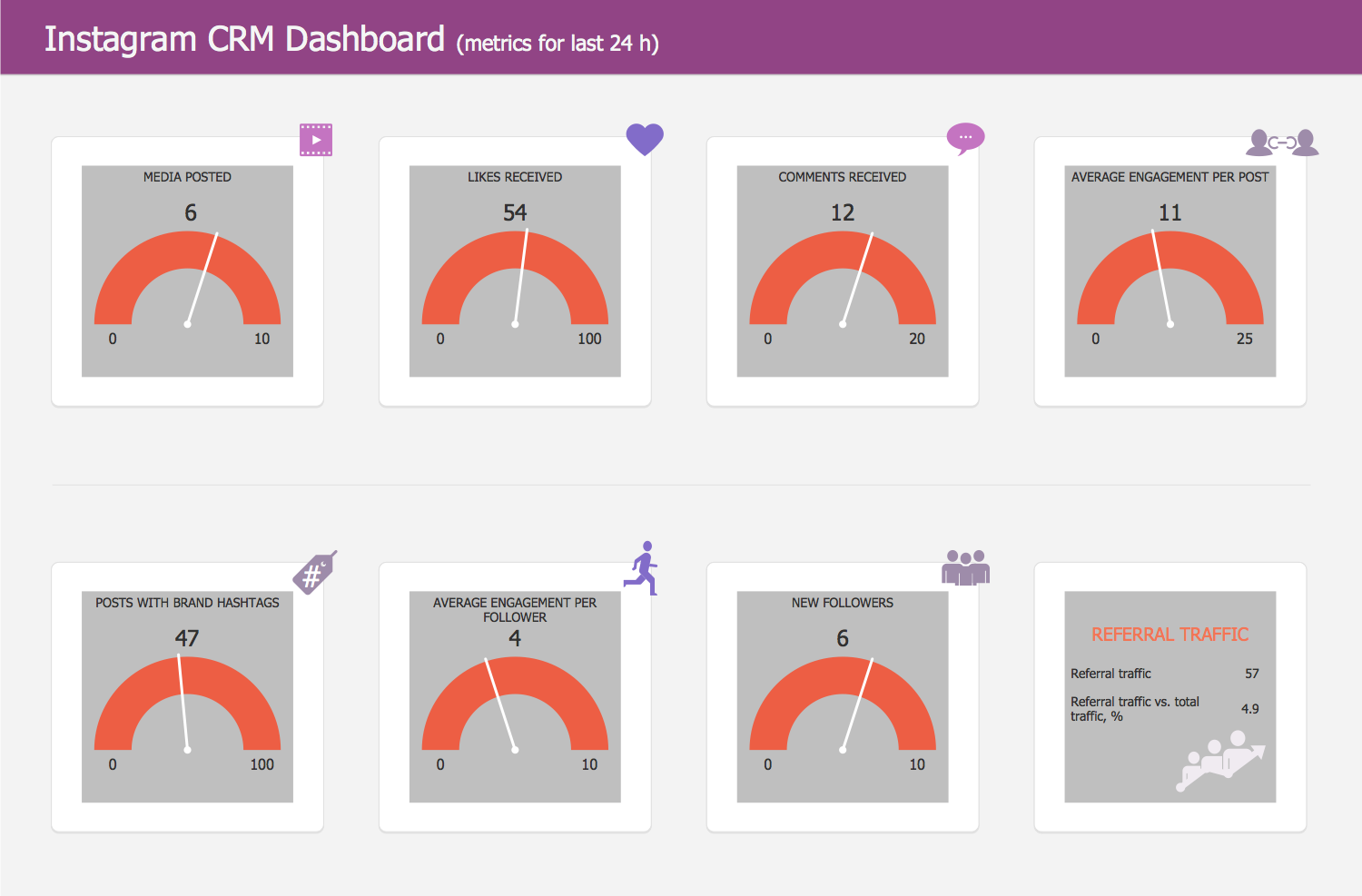 This sample dashboard is dedicated to the Instagram CRM and depicts the values of metrics for last 24 hours. You can observe a one-page ConceptDraw document with 8 indicators corresponding to the values of following business metrics and KPIs: Media posted indicator that measures your post number on Instagram for last 24 hours; Likes Received metric measures the likes on the Instagram posts for last 24 h; Comments Received depicts the number of comments on Instagram posts for last 24 h; Average Engagement per Post is an average of likes and comments per post for last 24 h; Posts with Brand Hashtags contains the data about quantity of posts with company brand hashtags; Average Engagement per Follower metric measures average number of likes and comments per follower for last 24 h; New Followers metric depicts the number of new follower for the last 24 h; and Referral Traffic that shows how much traffic your company website received from Instagram for last 24 h. The attached Excel source file contains 8 pages (each separate page for each KPI).