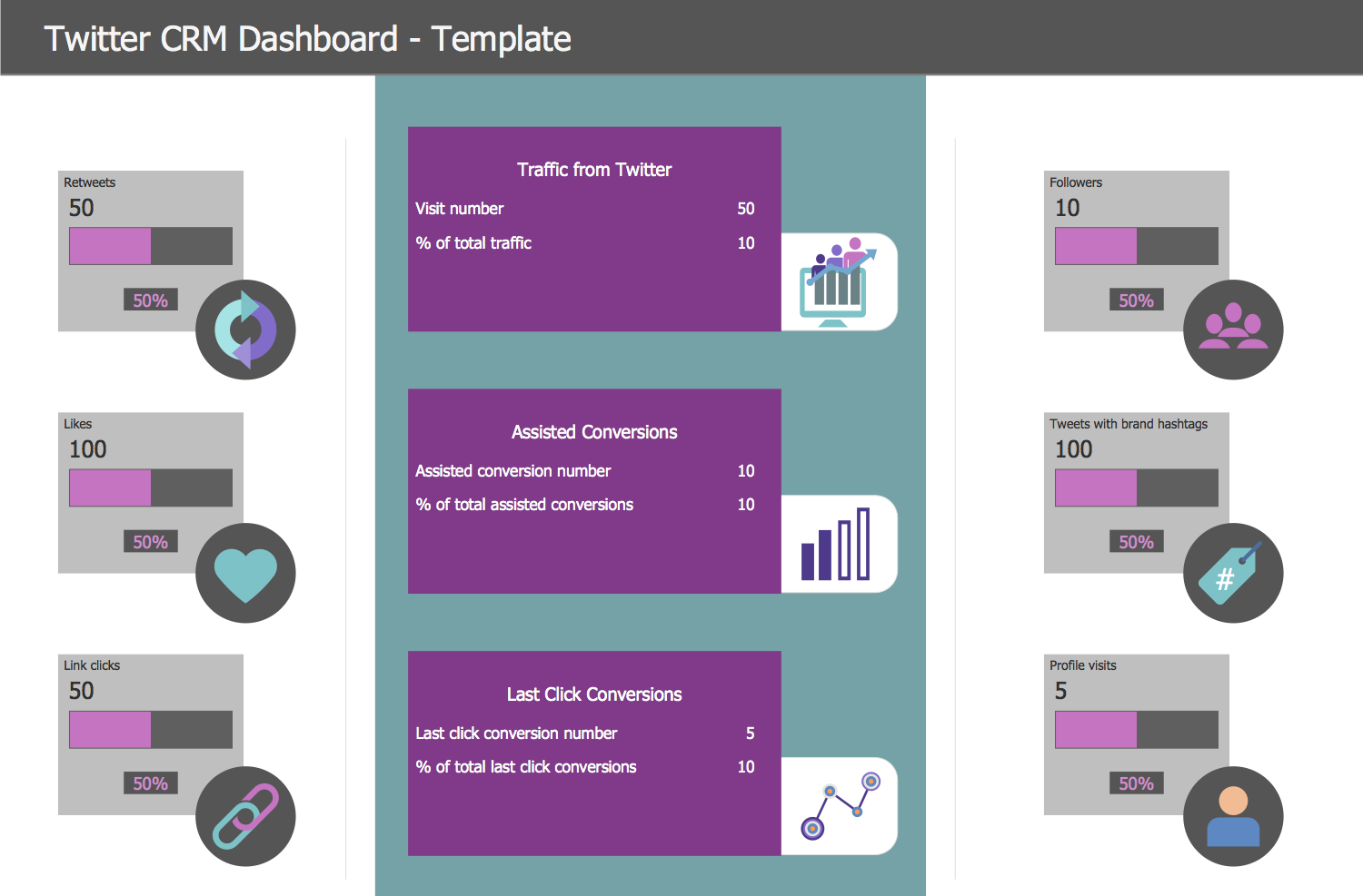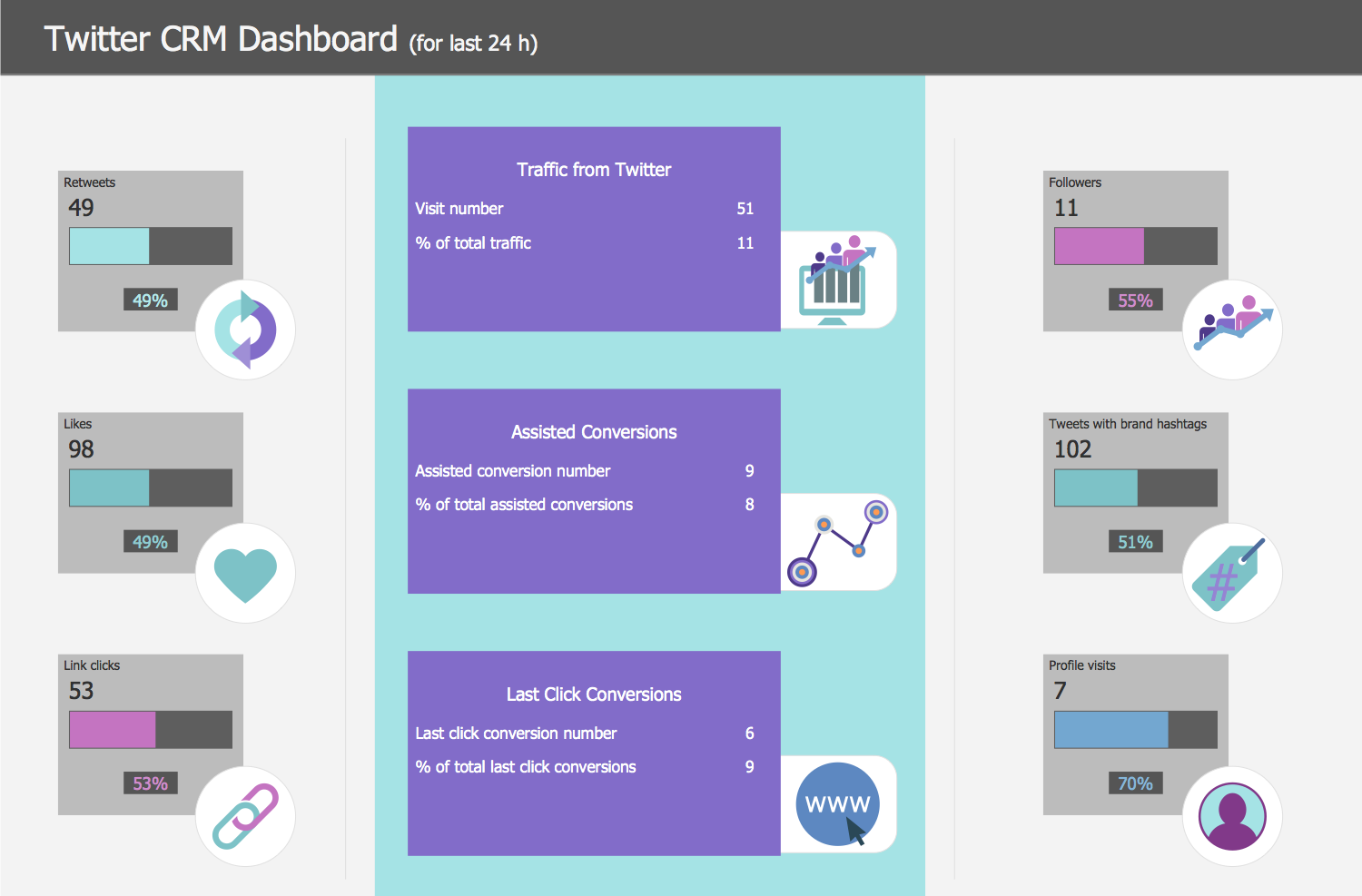 This Twitter CRM Dashboard template is designed to help you depict the main business metrics according to the using Twitter for the last 24 hours. It is a one-page ConceptDraw document on which 9 indicators can be filled with data from the attached source file (nine-page Excel document). This template depicts the following metrics: the number of retweets (default value equals 50), the likes number (default value is 100), the followers' number (by default 10), the number of clicks on the company’s website hyperlink (by default is set 50), the number of tweets with company brand hashtags (default value is 100), the Twitter profile visits number (by default is set 5), the number of company’s website visits and % of total website traffic (default values are 50 visits and 10% of total traffic), the number of assisted conversions and % of total assisted conversions (by default are set the values 10 and 10%), the last click conversions number and % of total last click conversions (default values are 5 and 10% of total last click conversions).