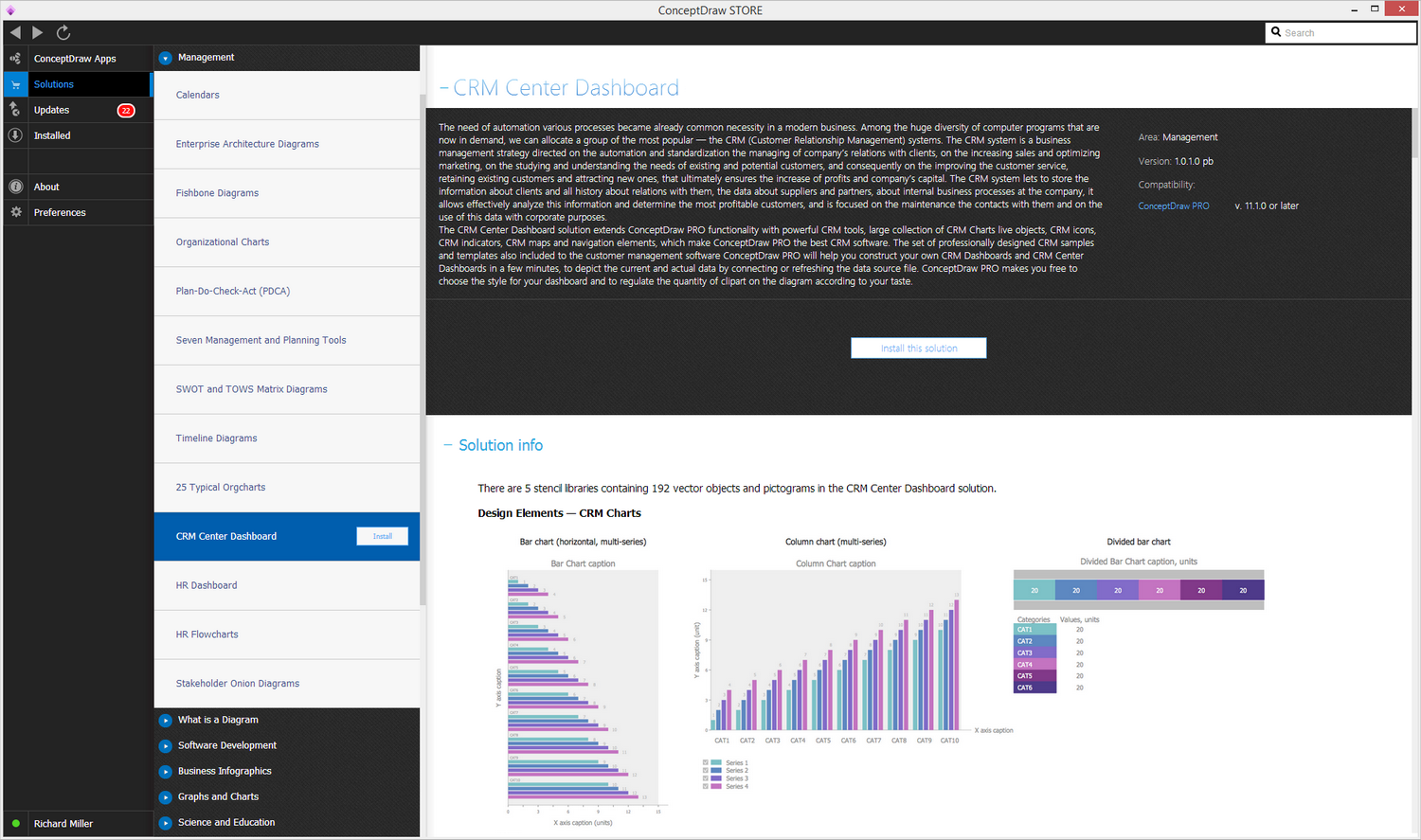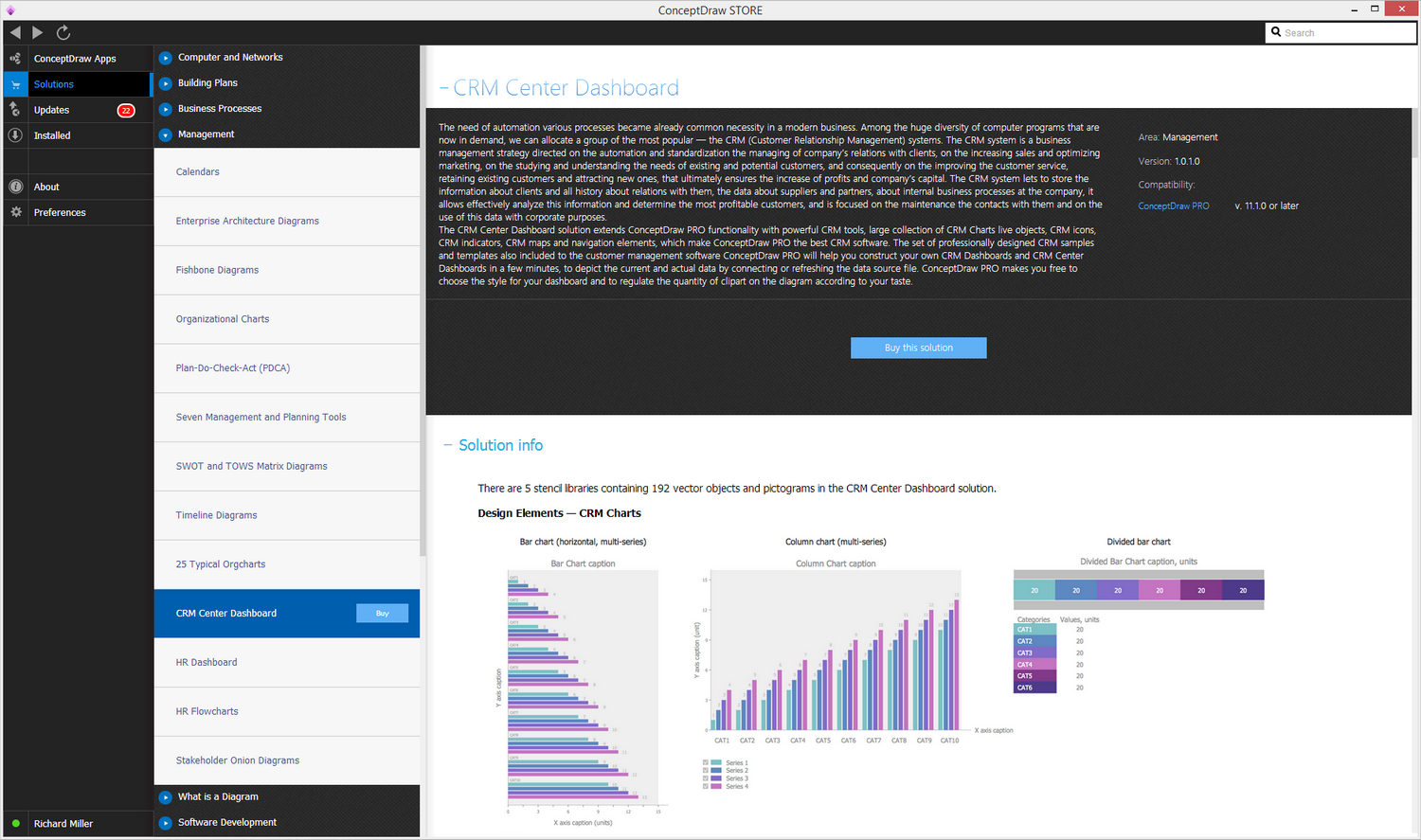 After ConceptDraw DIAGRAM is installed, the CRM Center Dashboard solution can be purchased either from the Management area of ConceptDraw STORE itself or from our online store. Thus, you will be able to use the CRM Center Dashboard solution straight after.
