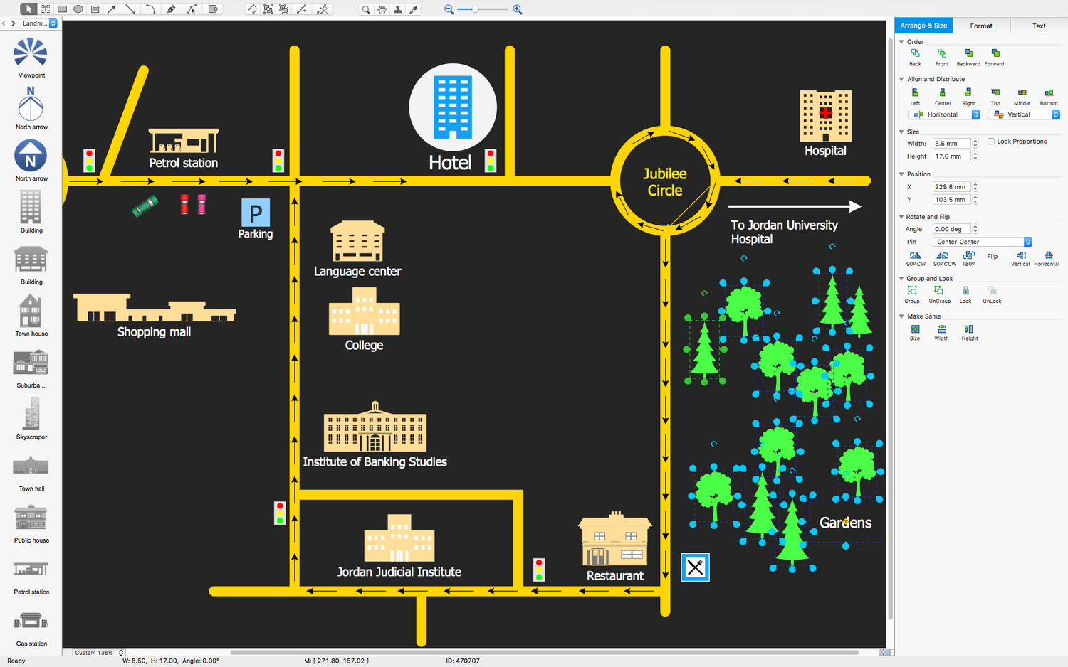This diagram was created in ConceptDraw DIAGRAM using the Roads and Junctions, and Landmarks Libraries from the Directional Maps Solution. An experienced user spent 10 minutes creating this sample.