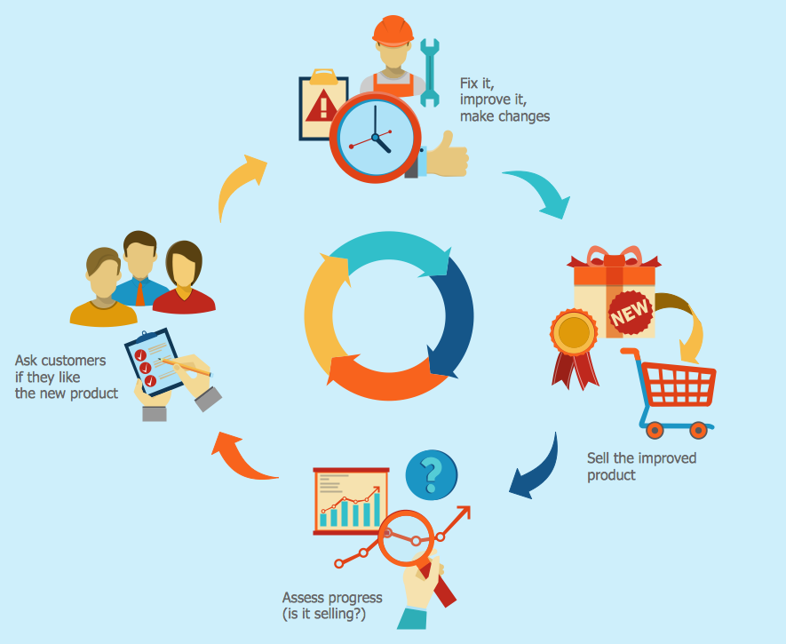 This Cycle process diagram shows the flowchart dedicated to the business feedback loop. This example is a typical Sales Flowchart, which was drawn by the forces of ConceptDraw DIAGRAM application on the base of Wikimedia Commons file "Business Feedback Loop PNG version.png". The feedback from the customers has a great value for business development and increasing sales. And really, according to this diagram you need to obligatory ask your customers if they like your new product, and in accordance to received feedback, if there are some disadvantages, you need to fix them, to improve and to make required changes, then to sell the improved product and to assess progress in selling. Use the ConceptDraw DIAGRAM application and Sales Flowcharts solution to create an informative and visually engaging Sales Process Flowcharts. The bright shades and chunky, stylized icons, symbols, pictograms and clipart mean you can add an artistic element to your flowchart design.
